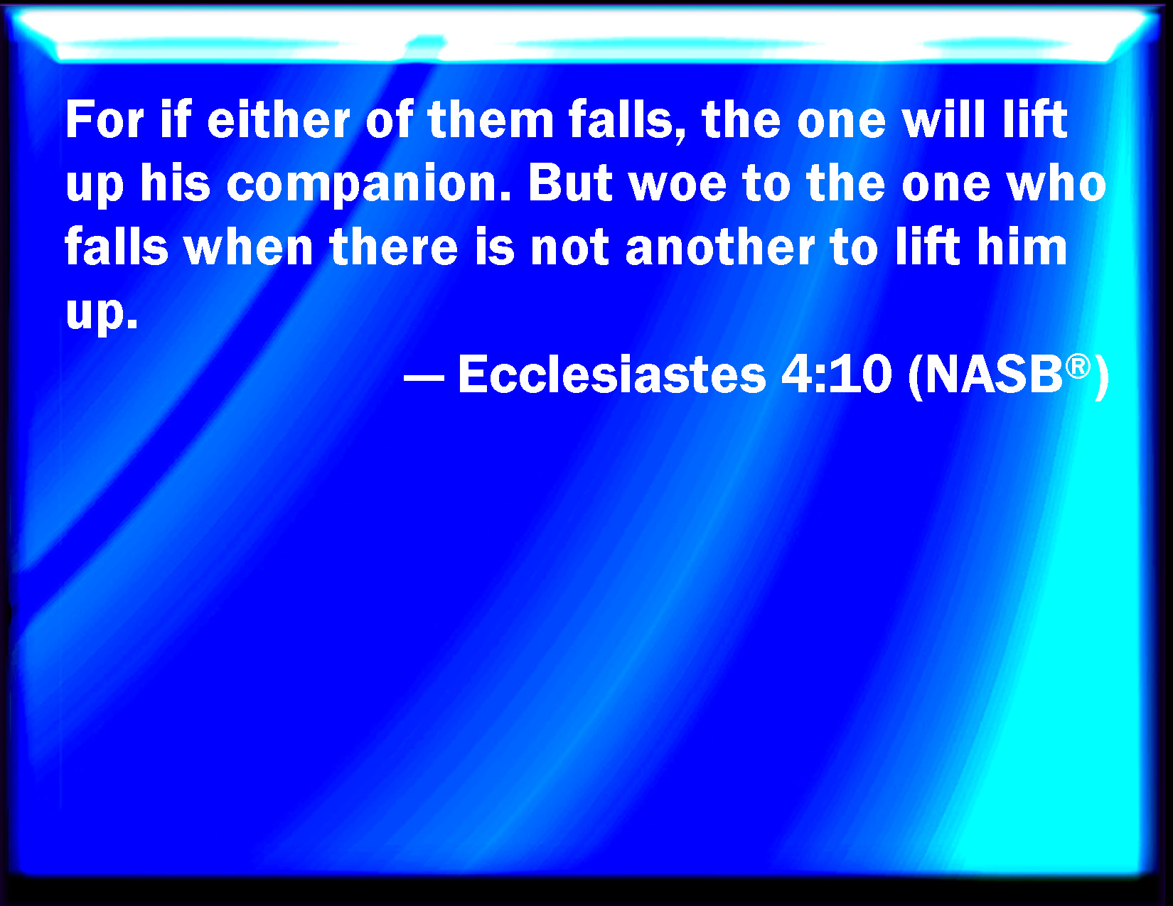 Bible Verse Slide Ecclesiastes 4:10 For if they fall, the one will lift up his fellow: but woe to him that is alone when he falls; for he has not another to help him up. KJV: For if they fall, the one will lift up his fellow: but woe to him that is alone when he falleth; for he hath not another to help him up. DRB: If one fall he shall be supported by the other: woe to him that is alone, for when he falleth, he hath none to lift him up. DBT: For if they fall, the one will lift up his fellow; but woe to him that is alone when he falleth, and who hath not another to lift him up! ERV: For if they fall, the one will lift up his fellow: but woe to him that is alone when he falleth, and hath not another to lift him up. WBT: For if they fall, the one will lift up his fellow: but woe to him that is alone when he falleth; for he hath not another to help him to rise. WEB: For if they fall, the one will lift up his fellow; but woe to him who is alone when he falls, and doesn't have another to lift him up. YLT: For if they fall, the one raiseth up his companion, but woe to the one who falleth and there is not a second to raise him up!Links Ecclesiastes 4:10 NIV • Ecclesiastes 4:10 NLT • Ecclesiastes 4:10 ESV • Ecclesiastes 4:10 NASB • Ecclesiastes 4:10 KJV • Ecclesiastes 4:10 Interlinear • Ecclesiastes 4:10 Commentaries • Ecclesiastes 4:10 Parallel Texts • Ecclesiastes 4:10 Bible Apps • Ecclesiastes 4:10 Parallel • Bible Hub |
