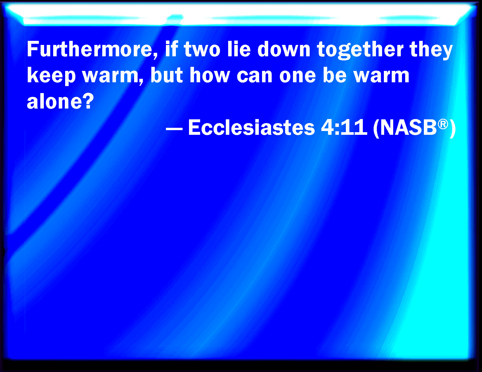 Bible Verse Slide Ecclesiastes 4:11 Again, if two lie together, then they have heat: but how can one be warm alone? KJV: Again, if two lie together, then they have heat: but how can one be warm alone? DRB: And if two lie together, they shall warm one another: how shall one alone be warmed? DBT: Again, if two lie together, then they have warmth; but how can one alone be warm? ERV: Again, if two lie together, then they have warmth: but how can one be warm alone? WBT: Again, if two lie together, then they have heat: but how can one be warm alone? WEB: Again, if two lie together, then they have warmth; but how can one keep warm alone? YLT: Also, if two lie down, then they have heat, but how hath one heat?Links Ecclesiastes 4:11 NIV • Ecclesiastes 4:11 NLT • Ecclesiastes 4:11 ESV • Ecclesiastes 4:11 NASB • Ecclesiastes 4:11 KJV • Ecclesiastes 4:11 Interlinear • Ecclesiastes 4:11 Commentaries • Ecclesiastes 4:11 Parallel Texts • Ecclesiastes 4:11 Bible Apps • Ecclesiastes 4:11 Parallel • Bible Hub |