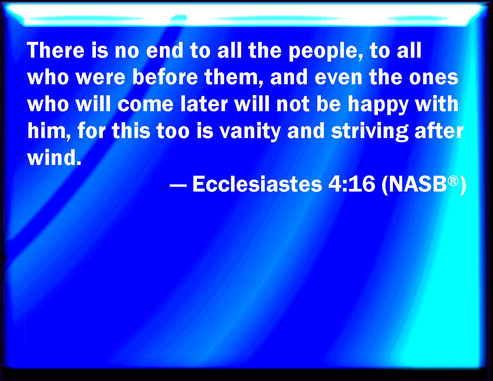 Bible Verse Slide Ecclesiastes 4:16 There is no end of all the people, even of all that have been before them: they also that come after shall not rejoice in him. Surely this also is vanity and vexation of spirit. KJV: There is no end of all the people, even of all that have been before them: they also that come after shall not rejoice in him. Surely this also is vanity and vexation of spirit. DRB: The number of the people, of all that were before him is infinite: and they that shall come afterwards, shall not rejoice in him: but this also is vanity, and vexation of spirit. DBT: There is no end of all the people, of all that stood before them; those however that come after shall not rejoice in him. Surely this also is vanity and a striving after the wind. ERV: There was no end of all the people, even of all them over whom he was: yet they that come after shall not rejoice in him. Surely this also is vanity and a striving after wind. WBT: There is no end of all the people, even of all that have been before them: they also that come after shall not rejoice in him. Surely this also is vanity and vexation of spirit. WEB: There was no end of all the people, even of all them over whom he was—yet those who come after shall not rejoice in him. Surely this also is vanity and a chasing after wind. YLT: there is no end to all the people, to all who were before them; also, the latter rejoice not in him. Surely this also is vanity and vexation of spirit.Links Ecclesiastes 4:16 NIV • Ecclesiastes 4:16 NLT • Ecclesiastes 4:16 ESV • Ecclesiastes 4:16 NASB • Ecclesiastes 4:16 KJV • Ecclesiastes 4:16 Interlinear • Ecclesiastes 4:16 Commentaries • Ecclesiastes 4:16 Parallel Texts • Ecclesiastes 4:16 Bible Apps • Ecclesiastes 4:16 Parallel • Bible Hub |