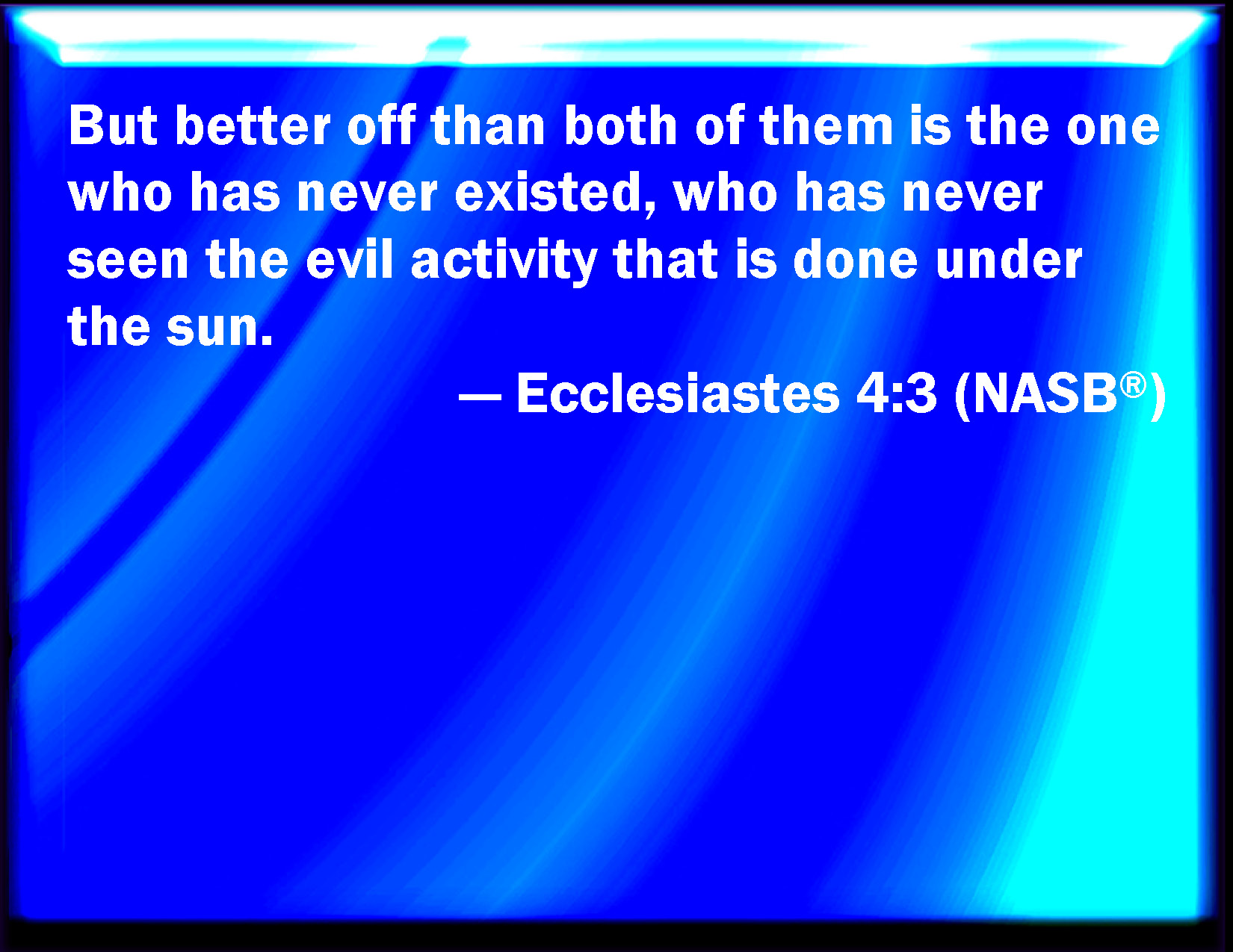 Bible Verse Slide Ecclesiastes 4:3 Yes, better is he than both they, which has not yet been, who has not seen the evil work that is done under the sun. KJV: Yea, better is he than both they, which hath not yet been, who hath not seen the evil work that is done under the sun. DRB: And I judged him happier than them both, that is not yet born, nor hath seen the evils that are done under the sun. DBT: and more fortunate than both is he who hath not yet been, who hath not seen the evil work that is done under the sun. ERV: yea, better than them both did I esteem him which hath not yet been, who hath not seen the evil work that is done under the sun. WBT: Yes, better is he than both they, who hath not yet been, who hath not seen the evil work that is done under the sun. WEB: Yes, better than them both is him who has not yet been, who has not seen the evil work that is done under the sun. YLT: And better than both of them is he who hath not yet been, in that he hath not seen the evil work that hath been done under the sun.Links Ecclesiastes 4:3 NIV • Ecclesiastes 4:3 NLT • Ecclesiastes 4:3 ESV • Ecclesiastes 4:3 NASB • Ecclesiastes 4:3 KJV • Ecclesiastes 4:3 Interlinear • Ecclesiastes 4:3 Commentaries • Ecclesiastes 4:3 Parallel Texts • Ecclesiastes 4:3 Bible Apps • Ecclesiastes 4:3 Parallel • Bible Hub |