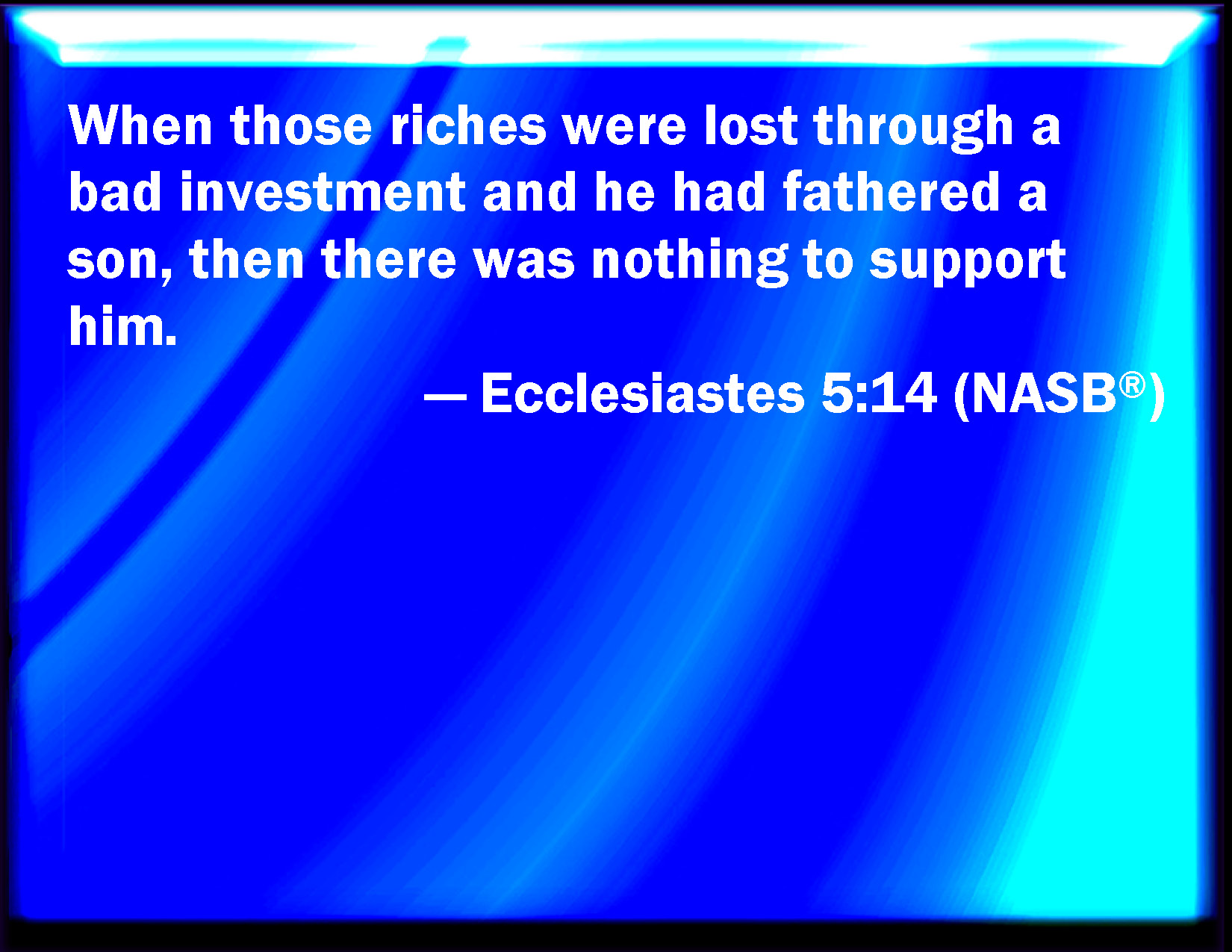 Bible Verse Slide Ecclesiastes 5:14 But those riches perish by evil travail: and he begets a son, and there is nothing in his hand. KJV: But those riches perish by evil travail: and he begetteth a son, and there is nothing in his hand. DRB: For they are lost with very great affliction: he hath begotten a son, who shall be in extremity of want. DBT: or those riches perish by some evil circumstance, and if he have begotten a son, there is nothing in his hand. ERV: and those riches perish by evil adventure; and if he hath begotten a son, there is nothing in his hand. WBT: But those riches perish by evil labor: and he begetteth a son, and there is nothing in his hand. WEB: Those riches perish by misfortune, and if he has fathered a son, there is nothing in his hand. YLT: And that wealth hath been lost in an evil business, and he hath begotten a son and there is nothing in his hand!Links Ecclesiastes 5:14 NIV • Ecclesiastes 5:14 NLT • Ecclesiastes 5:14 ESV • Ecclesiastes 5:14 NASB • Ecclesiastes 5:14 KJV • Ecclesiastes 5:14 Interlinear • Ecclesiastes 5:14 Commentaries • Ecclesiastes 5:14 Parallel Texts • Ecclesiastes 5:14 Bible Apps • Ecclesiastes 5:14 Parallel • Bible Hub |