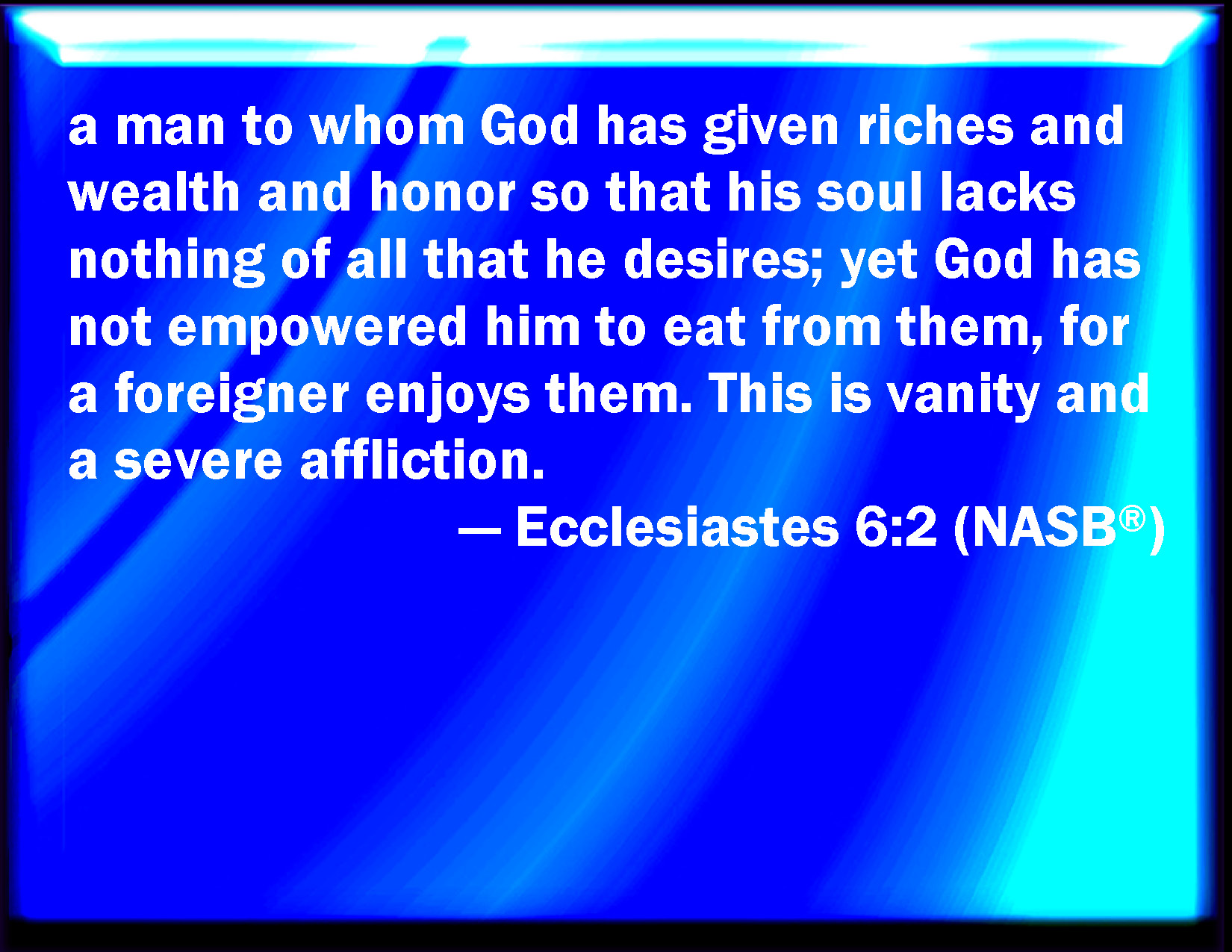Bible Verse Slide Ecclesiastes 6:2 A man to whom God has given riches, wealth, and honor, so that he wants nothing for his soul of all that he desires, yet God gives him not power to eat thereof, but a stranger eats it: this is vanity, and it is an evil disease. KJV: A man to whom God hath given riches, wealth, and honour, so that he wanteth nothing for his soul of all that he desireth, yet God giveth him not power to eat thereof, but a stranger eateth it: this is vanity, and it is an evil disease. DRB: A man to whom God hath given riches, and substance, and honour, and his soul wanteth nothing of all that he desireth: yet God doth not give him power to eat thereof, but a stranger shall eat it up. This is vanity and a great misery. DBT: one to whom God giveth riches, wealth, and honour, and he wanteth nothing for his soul of all that he desireth, yet God giveth him not power to eat thereof, but a stranger eateth it: this is vanity, and a sore evil. ERV: a man to whom God giveth riches, wealth, and honour, so that he lacketh nothing for his soul of all that he desireth, yet God giveth him not power to eat thereof, but a stranger eateth it; this is vanity, and it is an evil disease. WBT: A man to whom God hath given riches, wealth, and honor, so that he wanteth nothing for his soul of all that he desireth, yet God giveth him not power to eat of it, but a stranger eateth it: this is vanity, and it is an evil disease. WEB: a man to whom God gives riches, wealth, and honor, so that he lacks nothing for his soul of all that he desires, yet God gives him no power to eat of it, but an alien eats it. This is vanity, and it is an evil disease. YLT: A man to whom God giveth wealth, and riches, and honour, and there is no lack to his soul of all that he desireth, and God giveth him not power to eat of it, but a stranger eateth it; this is vanity, and it is an evil disease.Links Ecclesiastes 6:2 NIV • Ecclesiastes 6:2 NLT • Ecclesiastes 6:2 ESV • Ecclesiastes 6:2 NASB • Ecclesiastes 6:2 KJV • Ecclesiastes 6:2 Interlinear • Ecclesiastes 6:2 Commentaries • Ecclesiastes 6:2 Parallel Texts • Ecclesiastes 6:2 Bible Apps • Ecclesiastes 6:2 Parallel • Bible Hub |