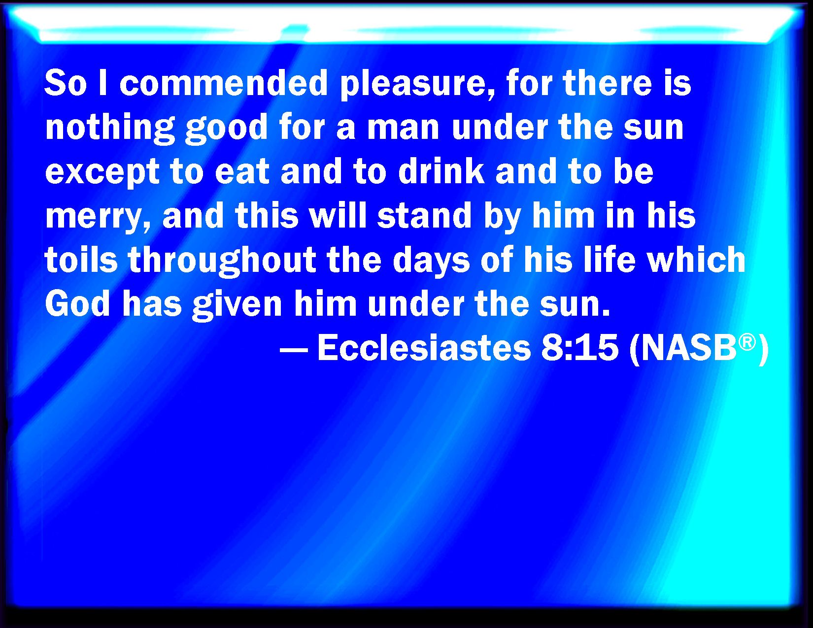 Bible Verse Slide Ecclesiastes 8:15 Then I commended mirth, because a man has no better thing under the sun, than to eat, and to drink, and to be merry: for that shall abide with him of his labor the days of his life, which God gives him under the sun. KJV: Then I commended mirth, because a man hath no better thing under the sun, than to eat, and to drink, and to be merry: for that shall abide with him of his labour the days of his life, which God giveth him under the sun. DRB: Therefore I commended mirth, because there was no good for a man under the sun, but to eat, and drink, and be merry, and that he should take nothing else with him of his labour in the days of his life, which God hath given him under the sun. DBT: And I commended mirth, because there is nothing better for man under the sun than to eat, and to drink, and to be merry; for that shall abide with him of his labour the days of his life, which God hath given him under the sun. ERV: Then I commended mirth, because a man hath no better thing under the sun, than to eat, and to drink, and to be merry: for that shall abide with him in his labour all the days of his life which God hath given him under the sun. WBT: Then I commended mirth, because a man hath no better thing under the sun, than to eat, and to drink, and to be merry: for that shall abide with him of his labor the days of his life, which God giveth him under the sun. WEB: Then I commended mirth, because a man has no better thing under the sun, than to eat, and to drink, and to be joyful: for that will accompany him in his labor all the days of his life which God has given him under the sun. YLT: And I have praised mirth because there is no good to man under the sun except to eat and to drink, and to rejoice, and it remaineth with him of his labour the days of his life that God hath given to him under the sun.Links Ecclesiastes 8:15 NIV • Ecclesiastes 8:15 NLT • Ecclesiastes 8:15 ESV • Ecclesiastes 8:15 NASB • Ecclesiastes 8:15 KJV • Ecclesiastes 8:15 Interlinear • Ecclesiastes 8:15 Commentaries • Ecclesiastes 8:15 Parallel Texts • Ecclesiastes 8:15 Bible Apps • Ecclesiastes 8:15 Parallel • Bible Hub |
