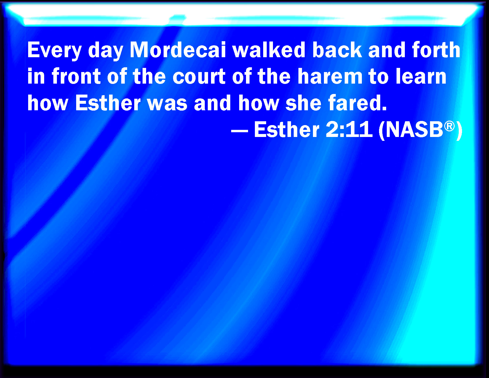 Bible Verse Slide Esther 2:11 And Mordecai walked every day before the court of the women's house, to know how Esther did, and what should become of her. KJV: And Mordecai walked every day before the court of the women's house, to know how Esther did, and what should become of her. DRB: And he walked every day before the court of the house, in which the chosen virgins werre kept, having a care for Esther's welfare, and desiring to know what would befall her. DBT: And Mordecai walked every day before the court of the women's house, to know how Esther did, and what should become of her. ERV: And Mordecai walked every day before the court of the women's house, to know how Esther did, and what should become of her. WBT: And Mordecai walked every day before the court of the women's house, to know how Esther did, and what would become of her. WEB: Mordecai walked every day in front of the court of the women's house, to find out how Esther did, and what would become of her. YLT: and during every day Mordecai is walking up and down before the court of the house of the women to know the welfare of Esther, and what is done with her.Links Esther 2:11 NIV • Esther 2:11 NLT • Esther 2:11 ESV • Esther 2:11 NASB • Esther 2:11 KJV • Esther 2:11 Interlinear • Esther 2:11 Commentaries • Esther 2:11 Parallel Texts • Esther 2:11 Bible Apps • Esther 2:11 Parallel • Bible Hub |