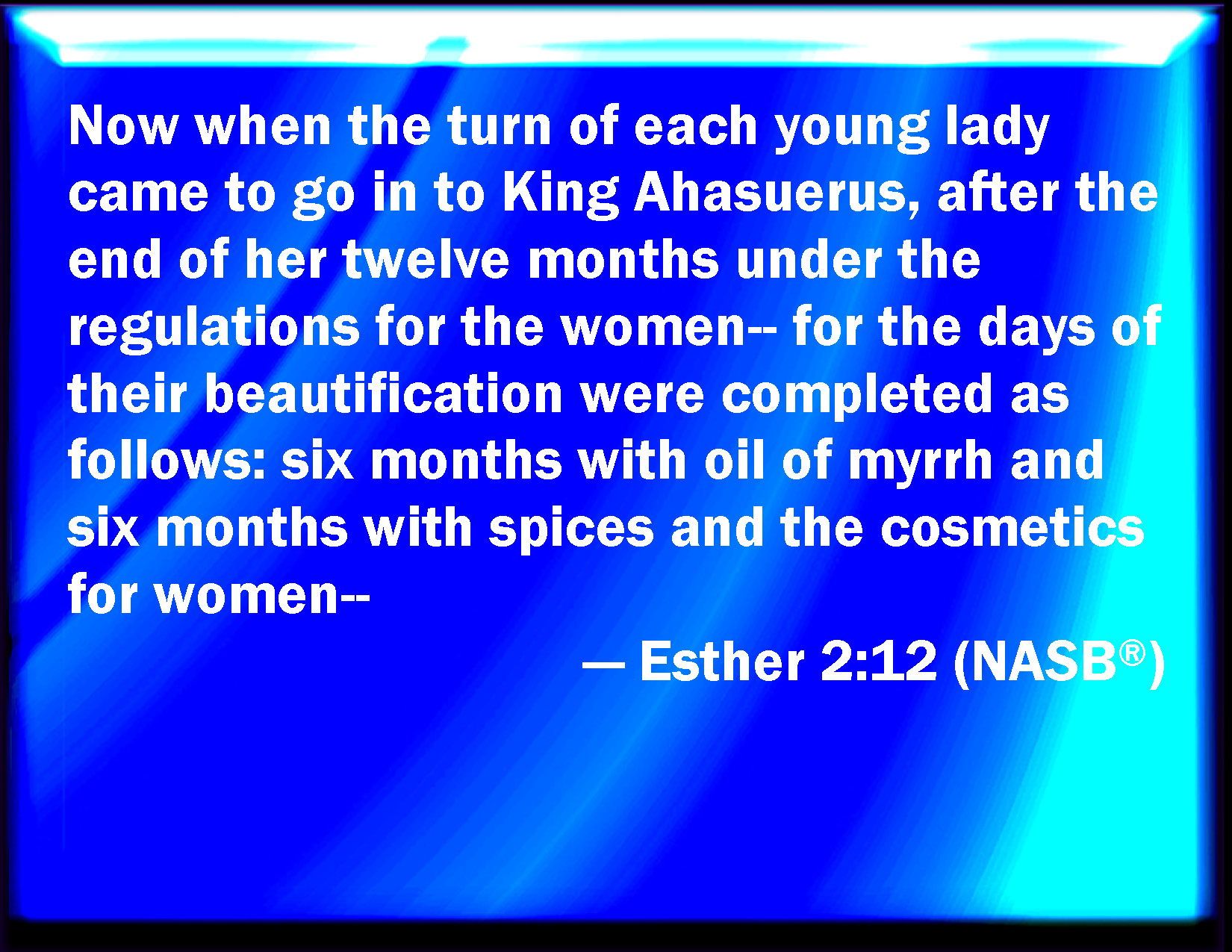 Bible Verse Slide Esther 2:12 Now when every maid's turn was come to go in to king Ahasuerus, after that she had been twelve months, according to the manner of the women, (for so were the days of their purifications accomplished, to wit, six months with oil of myrrh, and six months with sweet odors, and with other things for the purifying of the women;) KJV: Now when every maid's turn was come to go in to king Ahasuerus, after that she had been twelve months, according to the manner of the women, (for so were the days of their purifications accomplished, to wit, six months with oil of myrrh, and six months with sweet odours, and with other things for the purifying of the women;) DRB: Now when every virgin's turn came to go in to the king, after all had been done for setting them off to advantage, it was the twelfth month: so that for six months they were anointed with oil of myrrh, and for other six months they used certain perfumes and sweet spices. DBT: And when every maiden's turn came to go in to king Ahasuerus after that she had been treated for twelve months, according to the manner of the women (for so were the days of their purification accomplished six months with oil of myrrh, and six months with spices, and with things for the purifying of the women, ERV: Now when the turn of every maiden was come to go in to king Ahasuerus, after that it had been done to her according to the law for the women, twelve months, (for so were the days of their purifications accomplished, to wit, six months with oil of myrrh, and six months with sweet odours, and with the things for the purifying of the women,) WBT: Now when every maid's turn had come to go in to king Ahasuerus, after that she had been twelve months, according to the manner of the women, (for so were the days of their purifications accomplished, to wit, six months with oil of myrrh, and six months with sweet odors, and with other things for the purifying of the women;) WEB: Each young woman's turn came to go in to King Ahasuerus after her purification for twelve months (for so were the days of their purification accomplished, six months with oil of myrrh, and six months with sweet fragrances and with preparations for beautifying women). YLT: And in the drawing nigh of the turn of each young woman to come in unto the king Ahasuerus, at the end of there being to her — according to the law of the women — twelve months, for so they fulfil the days of their purifications; six months with oil of myrrh, and six months with spices, and with the purifications of women,Links Esther 2:12 NIV • Esther 2:12 NLT • Esther 2:12 ESV • Esther 2:12 NASB • Esther 2:12 KJV • Esther 2:12 Interlinear • Esther 2:12 Commentaries • Esther 2:12 Parallel Texts • Esther 2:12 Bible Apps • Esther 2:12 Parallel • Bible Hub |