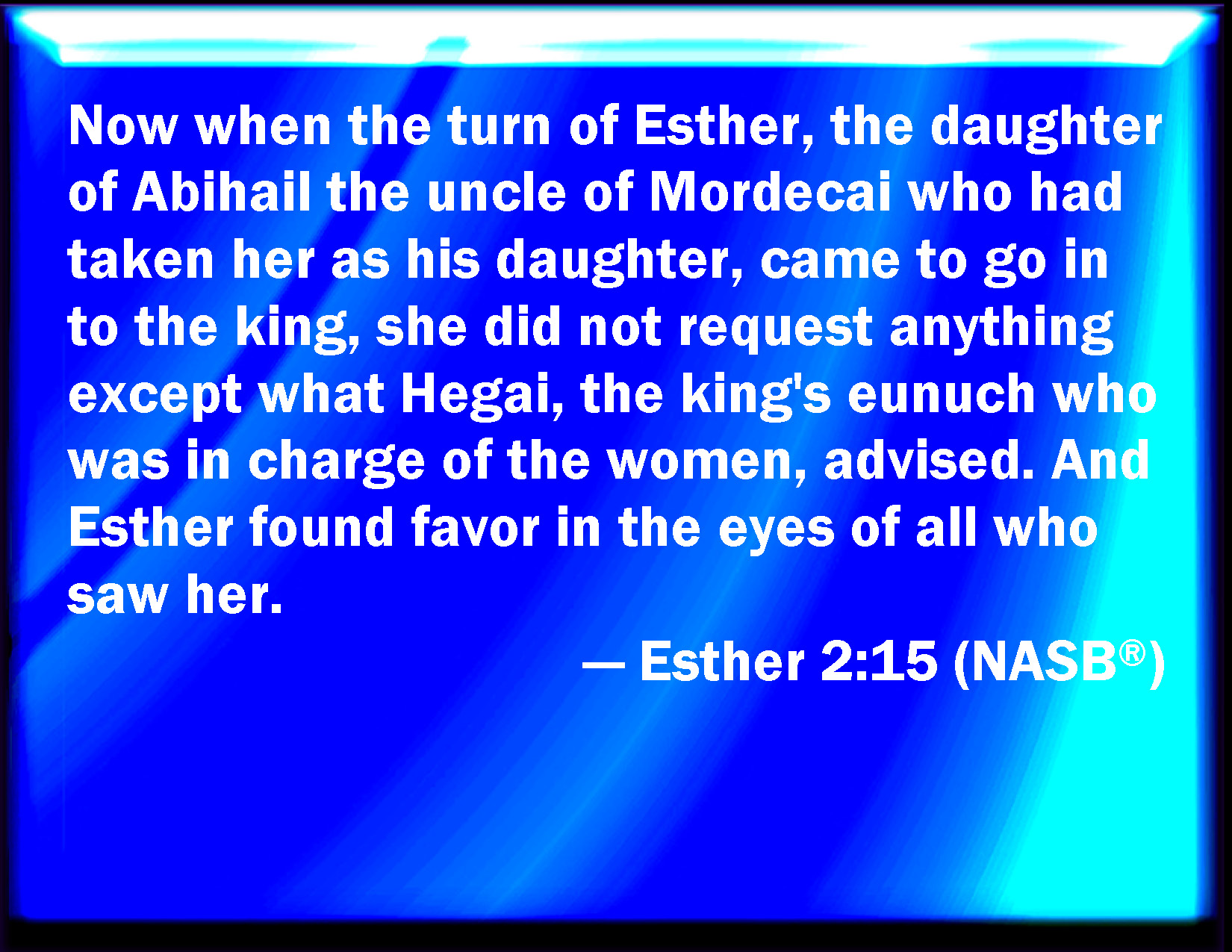 Bible Verse Slide Esther 2:15 Now when the turn of Esther, the daughter of Abihail the uncle of Mordecai, who had taken her for his daughter, was come to go in to the king, she required nothing but what Hegai the king's chamberlain, the keeper of the women, appointed. And Esther obtained favor in the sight of all them that looked on her. KJV: Now when the turn of Esther, the daughter of Abihail the uncle of Mordecai, who had taken her for his daughter, was come to go in unto the king, she required nothing but what Hegai the king's chamberlain, the keeper of the women, appointed. And Esther obtained favour in the sight of all them that looked upon her. DRB: And as the time came orderly about, the day was at hand, when Esther, the daughter of Abihail the brother of Mardochai, whom he had adopted for his daughter, was to go in to the king. But she sought not women's ornaments, but whatsoever Egeus the eunuch the keeper of the virgins had a mind, he gave her to adorn her. For she was exceeding fair, and her incredible beauty made her appear agreeable and amiable in the eyes of all. DBT: And when the turn of Esther, the daughter of Abihail the uncle of Mordecai, who had taken her for his daughter, came to go in to the king, she required nothing but what Hegai the king's chamberlain, keeper of the women, appointed. And Esther obtained grace in the sight of all them that saw her. ERV: Now when the turn of Esther, the daughter of Abihail the uncle of Mordecai, who had taken her for his daughter, was come to go in unto the king, she required nothing but what Hegai the king's chamberlain, the keeper of the women, appointed. And Esther obtained favour in the sight of all them that looked upon her. WBT: Now when the turn of Esther, the daughter of Abihail the uncle of Mordecai, who had taken her for his daughter, had come to go in to the king, she required nothing but what Hegai the king's chamberlain, the keeper of the women, appointed. And Esther obtained favor in the sight of all them that looked upon her. WEB: Now when the turn of Esther, the daughter of Abihail the uncle of Mordecai, who had taken her for his daughter, came to go in to the king, she required nothing but what Hegai the king's eunuch, the keeper of the women, advised. Esther obtained favor in the sight of all those who looked at her. YLT: And in the drawing nigh of the turn of Esther — daughter of Abihail, uncle of Mordecai, whom he had taken to him for a daughter — to come in unto the king, she hath not sought a thing except that which Hegai eunuch of the king, keeper of the women, saith, and Esther is receiving grace in the eyes of all seeing her.Links Esther 2:15 NIV • Esther 2:15 NLT • Esther 2:15 ESV • Esther 2:15 NASB • Esther 2:15 KJV • Esther 2:15 Interlinear • Esther 2:15 Commentaries • Esther 2:15 Parallel Texts • Esther 2:15 Bible Apps • Esther 2:15 Parallel • Bible Hub |