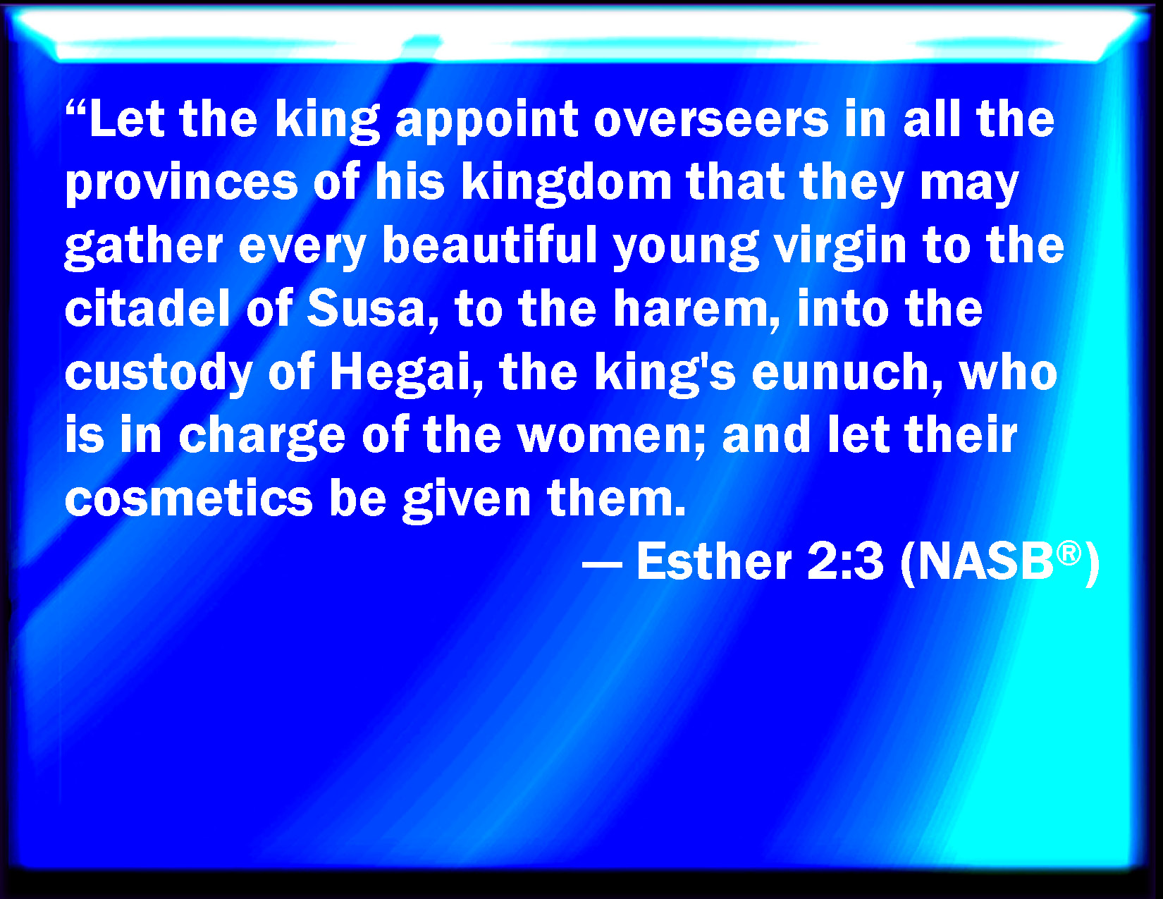 Bible Verse Slide Esther 2:3 And let the king appoint officers in all the provinces of his kingdom, that they may gather together all the fair young virgins to Shushan the palace, to the house of the women, to the custody of Hege the king's chamberlain, keeper of the women; and let their things for purification be given them: KJV: And let the king appoint officers in all the provinces of his kingdom, that they may gather together all the fair young virgins unto Shushan the palace, to the house of the women, unto the custody of Hege the king's chamberlain, keeper of the women; and let their things for purification be given them: DRB: And let some persons be sent through all the provinces to look for beautiful maidens and virgins: and let them bring them to the city of Susan, and put them into the house of the women under the hand of Egeus the eunuch, who is the overseer and keeper of the king's women: and let them receive women's ornaments, and other things necessary for their use. DBT: and let the king appoint officers in all the provinces of his kingdom, that they may gather together all the young virgins of beautiful countenance to Shushan the fortress, to the house of the women, unto the custody of Hegai the king's chamberlain, keeper of the women; and let their things for purification be given. ERV: and let the king appoint officers in all the provinces of his kingdom, that young virgins unto Shushan the palace, they may gather together all the fair to the house of the women, unto the custody of Hegai the king's chamberlain, keeper of the women; and let their things for purification be given them: WBT: And let the king appoint officers in all the provinces of his kingdom, that they may collect all the fair young virgins to Shushan the palace, to the house of the women, into the custody of Hege the king's chamberlain, keeper of the women; and let their things for purification be given them: WEB: Let the king appoint officers in all the provinces of his kingdom, that they may gather together all the beautiful young virgins to the citadel of Susa, to the women's house, to the custody of Hegai the king's eunuch, keeper of the women. Let cosmetics be given them; YLT: and the king doth appoint inspectors in all provinces of his kingdom, and they gather every young woman — virgin, of good appearance — unto Shushan the palace, unto the house of the women, unto the hand of Hege eunuch of the king, keeper of the women, and to give their purifications,Links Esther 2:3 NIV • Esther 2:3 NLT • Esther 2:3 ESV • Esther 2:3 NASB • Esther 2:3 KJV • Esther 2:3 Interlinear • Esther 2:3 Commentaries • Esther 2:3 Parallel Texts • Esther 2:3 Bible Apps • Esther 2:3 Parallel • Bible Hub |