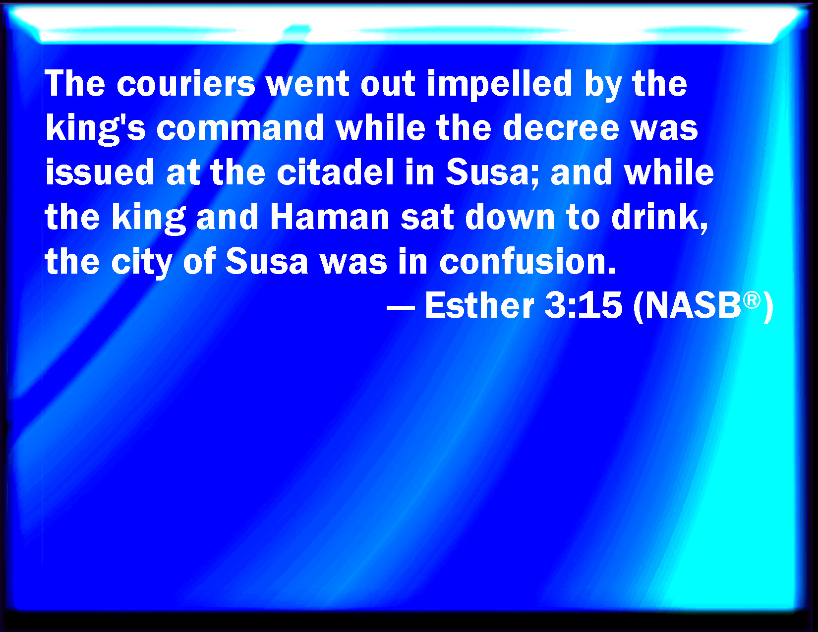 Bible Verse Slide Esther 3:15 The posts went out, being hastened by the king's commandment, and the decree was given in Shushan the palace. And the king and Haman sat down to drink; but the city Shushan was perplexed. KJV: The posts went out, being hastened by the king's commandment, and the decree was given in Shushan the palace. And the king and Haman sat down to drink; but the city Shushan was perplexed. DRB: The couriers that were sent made haste to fulfil the king's commandment. And immediately the edict was hung up in Susan, the king and Aman feasting together, and all the Jews that were in the city weeping. DBT: The couriers went out, being hastened by the king's commandment, and the decree was given in Shushan the fortress. And the king and Haman sat down to drink; but the city of Shushan was in consternation. ERV: The posts went forth in haste by the king's commandment, and the decree was given out in Shushan the palace: and the king and Haman sat down to drink; but the city of Shushan was perplexed. WBT: The posts departed, being hastened by the king's commandment, and the decree was given in Shushan the palace. And the king and Haman sat down to drink; but the city Shushan was perplexed. WEB: The couriers went forth in haste by the king's commandment, and the decree was given out in the citadel of Susa. The king and Haman sat down to drink; but the city of Shushan was perplexed. YLT: The runners have gone forth, hastened by the word of the king, and the law hath been given in Shushan the palace, and the king and Haman have sat down to drink, and the city Shushan is perplexed.Links Esther 3:15 NIV • Esther 3:15 NLT • Esther 3:15 ESV • Esther 3:15 NASB • Esther 3:15 KJV • Esther 3:15 Interlinear • Esther 3:15 Commentaries • Esther 3:15 Parallel Texts • Esther 3:15 Bible Apps • Esther 3:15 Parallel • Bible Hub |