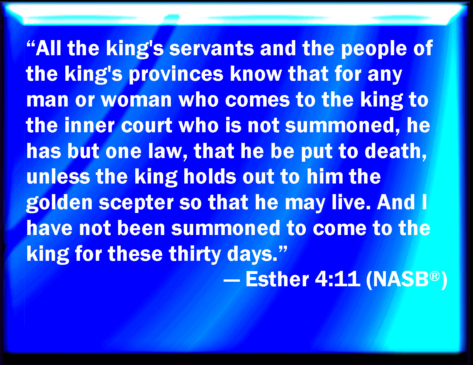 Bible Verse Slide Esther 4:11 All the king's servants, and the people of the king's provinces, do know, that whoever, whether man or women, shall come to the king into the inner court, who is not called, there is one law of his to put him to death, except such to whom the king shall hold out the golden scepter, that he may live: but I have not been called to come in to the king these thirty days. KJV: All the king's servants, and the people of the king's provinces, do know, that whosoever, whether man or woman, shall come unto the king into the inner court, who is not called, there is one law of his to put him to death, except such to whom the king shall hold out the golden sceptre, that he may live: but I have not been called to come in unto the king these thirty days. DRB: 11All the king's servants, and all the provinces that are under his dominion, know, that whosoever, whether man or woman, cometh into the king's inner court, who is not called for, is immediately to be put to death without any delay: except the king shall hold out the golden sceptre to him, in token of clemency, that so he may live. How then can I go in to the king, who for these thirty days now have not been called unto him? DBT: All the king's servants and the people of the king's provinces do know that whoever, whether man or woman, shall come to the king into the inner court, who is not called, there is one law, to put him to death, except such to whom the king shall hold out the golden sceptre, that he may live; and I have not been called to come in unto the king these thirty days. ERV: All the king's servants, and the people of the king's provinces, do know, that whosoever, whether man or woman, shall come unto the king into the inner court, who is not called, there is one law for him, that he be put to death, except such to whom the king shall hold out the golden sceptre, that he may live: but I have not been called to come in unto the king these thirty days. WBT: All the king's servants, and the people of the king's provinces, do know, that whoever, whether man or woman, shall come to the king into the inner court, who is not called, there is one law of his to put him to death, except him to whom the king shall hold out the golden scepter, that he may live: but I have not been called to come in to the king these thirty days. WEB: "All the king's servants, and the people of the king's provinces, know, that whoever, whether man or woman, comes to the king into the inner court without being called, there is one law for him, that he be put to death, except those to whom the king might hold out the golden scepter, that he may live. I have not been called to come in to the king these thirty days." YLT: All servants of the king, and people of the provinces of the king, do know that any man and woman, who cometh in unto the king, unto the inner court, who is not called — one law of his is to put them to death, apart from him to whom the king holdeth out the golden sceptre, then he hath lived; and I — I have not been called to come in unto the king these thirty days.'Links Esther 4:11 NIV • Esther 4:11 NLT • Esther 4:11 ESV • Esther 4:11 NASB • Esther 4:11 KJV • Esther 4:11 Interlinear • Esther 4:11 Commentaries • Esther 4:11 Parallel Texts • Esther 4:11 Bible Apps • Esther 4:11 Parallel • Bible Hub |