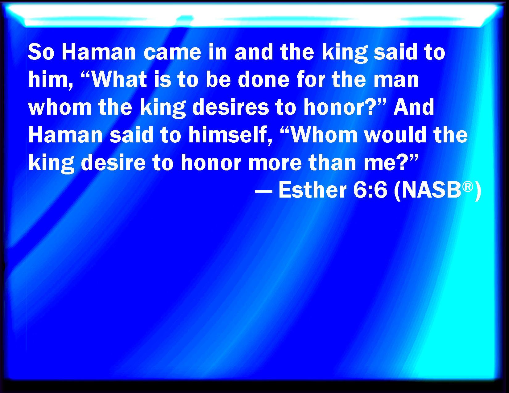 Bible Verse Slide Esther 6:6 So Haman came in. And the king said to him, What shall be done to the man whom the king delights to honor? Now Haman thought in his heart, To whom would the king delight to do honor more than to myself? KJV: So Haman came in. And the king said unto him, What shall be done unto the man whom the king delighteth to honour? Now Haman thought in his heart, To whom would the king delight to do honour more than to myself? DRB: And when he was come in, he said to him: What ought to be done to the man whom the king is desirous to honour? But Aman thinking in his heart, and supposing that the king would honour no other but himself, DBT: So Haman came in. And the king said to him, What is to be done with the man whom the king delights to honour? Now Haman thought in his heart, To whom would the king delight to do honour more than to me? ERV: So Haman came in. And the king said unto him, What shall be done unto the man whom the king delighteth to honour? Now Haman said in his heart, To whom would the king delight to do honour more than to myself? WBT: So Haman came in. And the king said to him, What shall be done to the man whom the king delighteth to honor? Now Haman thought in his heart, To whom would the king delight to do honor more than to myself? WEB: So Haman came in. The king said to him, "What shall be done to the man whom the king delights to honor?" Now Haman said in his heart, "Who would the king delight to honor more than myself?" YLT: And Haman cometh in, and the king saith to him, 'What — to do with the man in whose honour the king hath delighted?' And Haman saith in his heart, 'To whom doth the king delight to do honour more than myself?'Links Esther 6:6 NIV • Esther 6:6 NLT • Esther 6:6 ESV • Esther 6:6 NASB • Esther 6:6 KJV • Esther 6:6 Interlinear • Esther 6:6 Commentaries • Esther 6:6 Parallel Texts • Esther 6:6 Bible Apps • Esther 6:6 Parallel • Bible Hub |