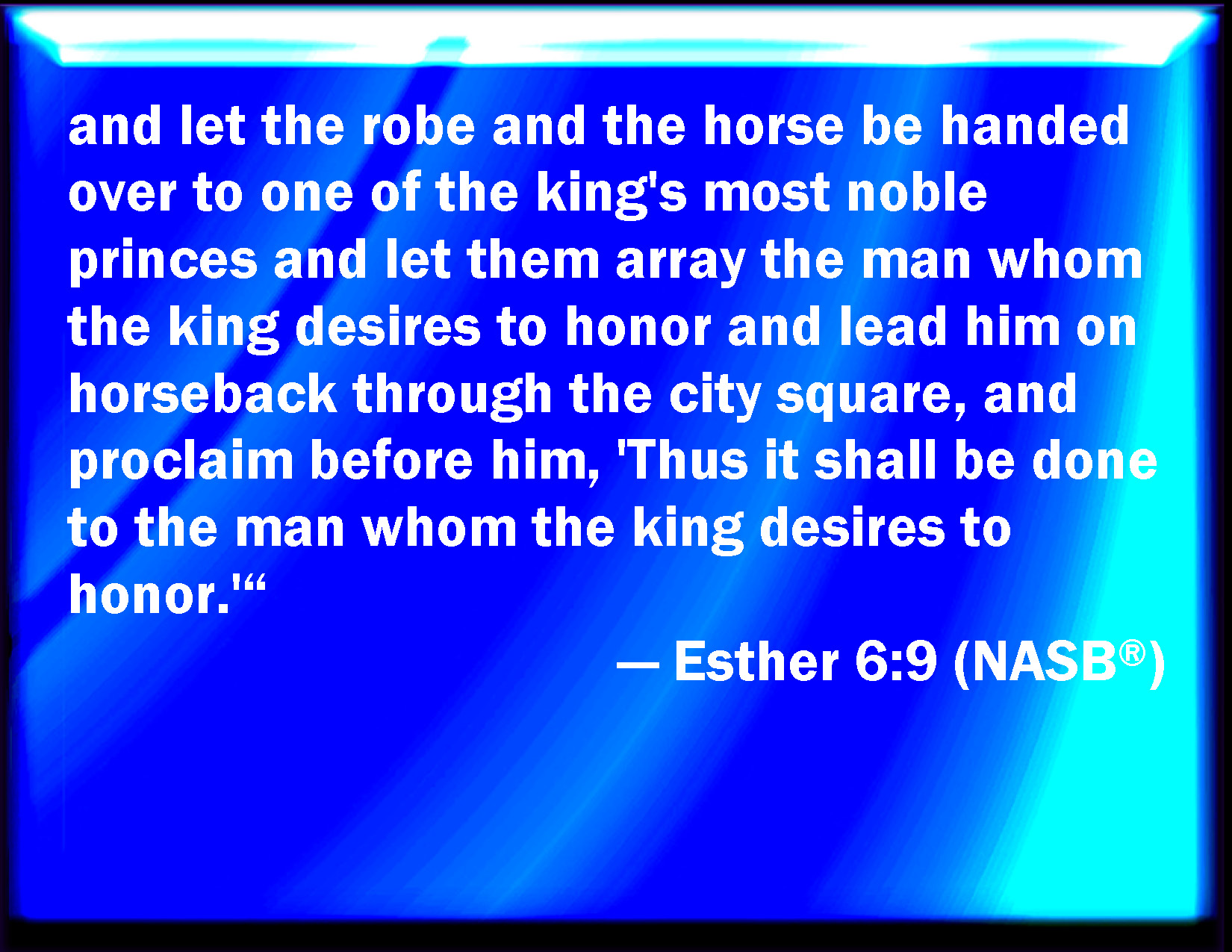 Esther 6:9 And let this apparel and horse be delivered to the hand of one of the king's most noble princes, that they may array the man with whom the king delights to honor, and bring him on horseback through the street of the city, and proclaim before him, Thus shall it be done to the man whom the king delights to honor.