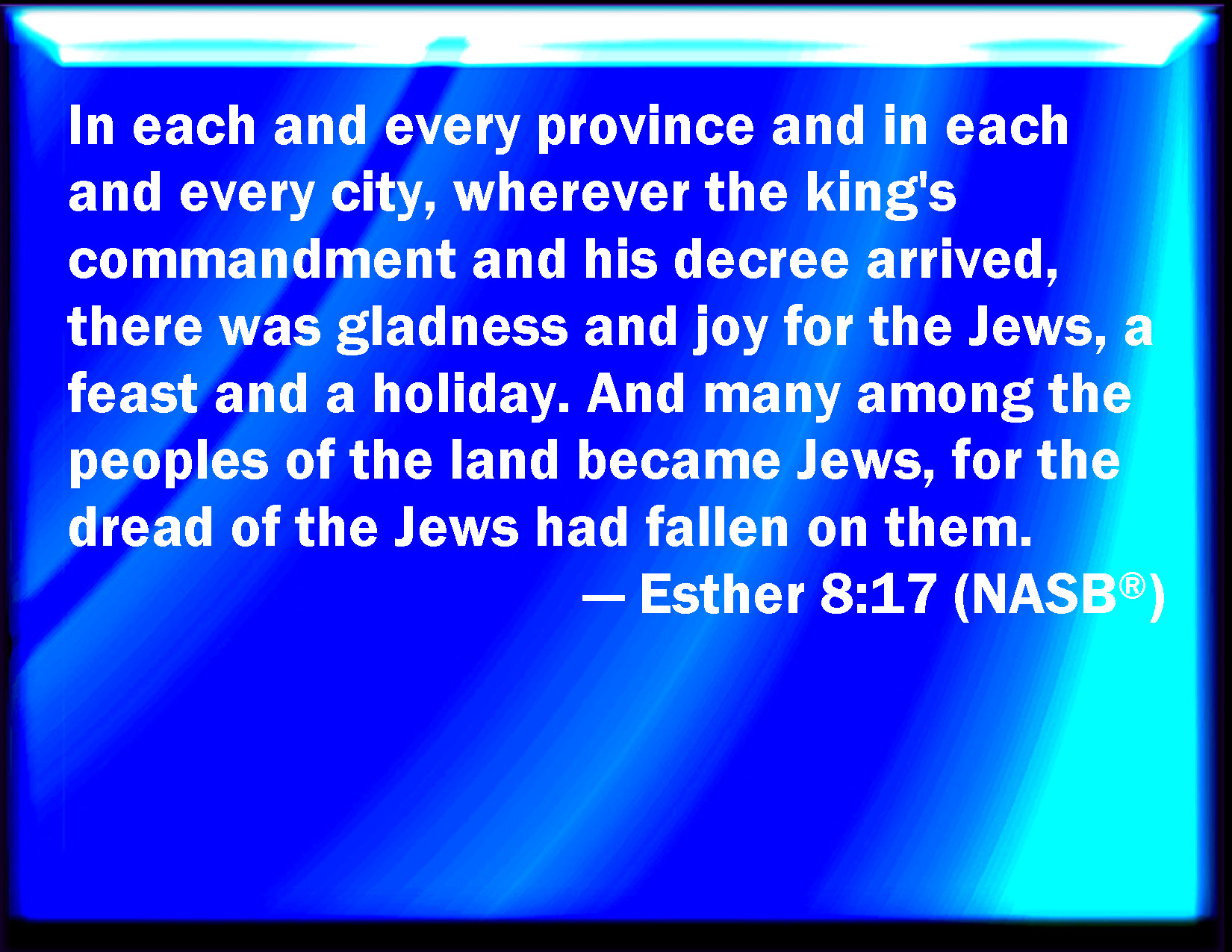 Bible Verse Slide Esther 8:17 And in every province, and in every city, wherever the king's commandment and his decree came, the Jews had joy and gladness, a feast and a good day. And many of the people of the land became Jews; for the fear of the Jews fell on them. KJV: And in every province, and in every city, whithersoever the king's commandment and his decree came, the Jews had joy and gladness, a feast and a good day. And many of the people of the land became Jews; for the fear of the Jews fell upon them. DRB: And in all peoples, cities, and provinces, whithersoever the king's commandments came, there was wonderful rejoicing, feasts and banquets, and keeping holy day: insomuch that many of other nations and religion, joined themselves to their worship and ceremonies. For a great dread of the name of the Jews had fallen upon all. DBT: And in every province, and in every city, wherever the king's commandment and his decree came, the Jews had joy and gladness, a feast and a good day. And many among the peoples of the land became Jews; for the fear of the Jews had fallen upon them. ERV: And in every province, and in every city, whithersoever the king's commandment and his decree came, the Jews had gladness and joy, a feast and a good day. And many from among the peoples of the land became Jews; for the fear of the Jews was fallen upon them. WBT: And in every province, and in every city, whithersoever the king's commandment and his decree came, the Jews had joy and gladness, a feast and a good day. And many of the people of the land became Jews; for the fear of the Jews fell upon them. WEB: In every province, and in every city, wherever the king's commandment and his decree came, the Jews had gladness, joy, a feast, and a good day. Many from among the peoples of the land became Jews; for the fear of the Jews was fallen on them. YLT: and in every province and province, and in every city and city, the place where the word of the king, even his law, is coming, gladness and joy are to the Jews, a banquet, and a good day; and many of the peoples of the land are becoming Jews, for a fear of the Jews hath fallen upon them.Links Esther 8:17 NIV • Esther 8:17 NLT • Esther 8:17 ESV • Esther 8:17 NASB • Esther 8:17 KJV • Esther 8:17 Interlinear • Esther 8:17 Commentaries • Esther 8:17 Parallel Texts • Esther 8:17 Bible Apps • Esther 8:17 Parallel • Bible Hub |