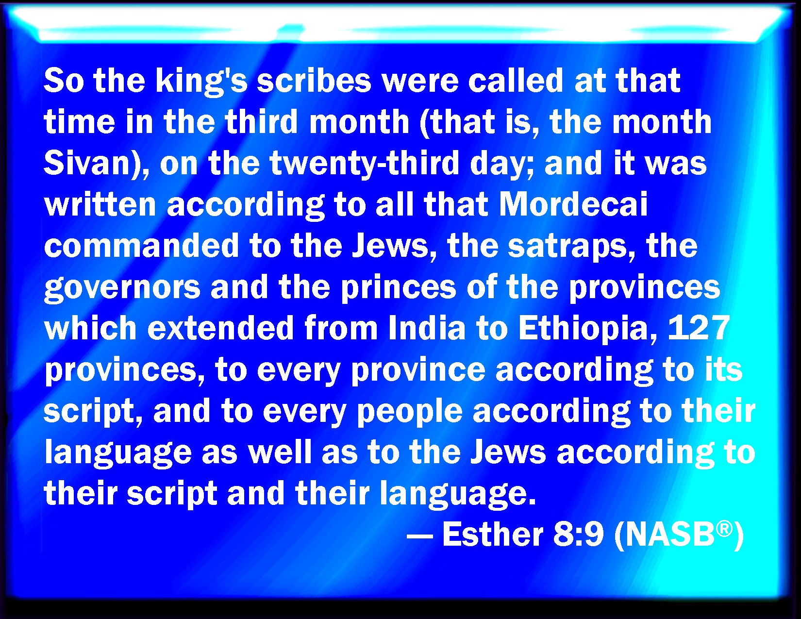 Bible Verse Slide Esther 8:9 Then were the king's scribes called at that time in the third month, that is, the month Sivan, on the three and twentieth day thereof; and it was written according to all that Mordecai commanded to the Jews, and to the lieutenants, and the deputies and rulers of the provinces which are from India to Ethiopia, an hundred twenty and seven provinces, to every province according to the writing thereof, and to every people after their language, and to the Jews according to their writing, and according to their language. KJV: Then were the king's scribes called at that time in the third month, that is, the month Sivan, on the three and twentieth day thereof; and it was written according to all that Mordecai commanded unto the Jews, and to the lieutenants, and the deputies and rulers of the provinces which are from India unto Ethiopia, an hundred twenty and seven provinces, unto every province according to the writing thereof, and unto every people after their language, and to the Jews according to their writing, and according to their language. DRB: Then the king's scribes and secretaries were called for (now it was the time of the third month which is called Siban) the three and twentieth day of the month, and letters were written, as Mardochai had a mind, to the Jews, and to the governors, and to the deputies, and to the judges, who were rulers over the hundred and twenty-seven provinces, from India even to Ethiopia: to province and province, to people and people, according to their languages and characters, and to the Jews, according as they could read and hear. DBT: Then were the king's scribes called at that time, in the third month, that is, the month Sivan, on the three and twentieth day thereof; and it was written according to all that Mordecai commanded, to the Jews, and to the satraps, and the governors, and the princes of the provinces which are from India even to Ethiopia, a hundred and twenty-seven provinces, to every province according to the writing thereof, and to every people according to their language, and to the Jews according to their writing and according to their language. ERV: Then were the king's scribes called at that time, in the third month, which is the month, Sivan, on the three and twentieth day thereof; and it was written according to all that Mordecai commanded unto the Jews, and to the satraps, and the governors and princes of the provinces which are from India unto Ethiopia, an hundred twenty and seven provinces, unto every province according to the writing thereof, and unto every people after their language, and to the Jews according to their writing, and according to their language. WBT: Then were the king's scribes called at that time in the third month, that is, the month Sivan, on the three and twentieth day of it; and it was written, according to all that Mordecai commanded, to the Jews, and to the lieutenants, and the deputies and rulers of the provinces which are from India to Cush, a hundred twenty and seven provinces, to every province according to the writing of it, and to every people after their language, and to the Jews according to their writing, and according to their language. WEB: Then the king's scribes were called at that time, in the third month Sivan, on the twenty-third day of the month; and it was written according to all that Mordecai commanded to the Jews, and to the satraps, and the governors and princes of the provinces which are from India to Ethiopia, one hundred twenty-seven provinces, to every province according to its writing, and to every people in their language, and to the Jews in their writing, and in their language. YLT: And the scribes of the king are called, at that time, in the third month — it is the month of Sivan — in the three and twentieth of it, and it is written, according to all that Mordecai hath commanded, unto the Jews, and unto the lieutenants, and the governors, and the heads of the provinces, that are from Hodu even unto Cush, seven and twenty and a hundred provinces — province and province according to its writing, and people and people according to its tongue, and unto the Jews according to their writing, and according to their tongue.Links Esther 8:9 NIV • Esther 8:9 NLT • Esther 8:9 ESV • Esther 8:9 NASB • Esther 8:9 KJV • Esther 8:9 Interlinear • Esther 8:9 Commentaries • Esther 8:9 Parallel Texts • Esther 8:9 Bible Apps • Esther 8:9 Parallel • Bible Hub |