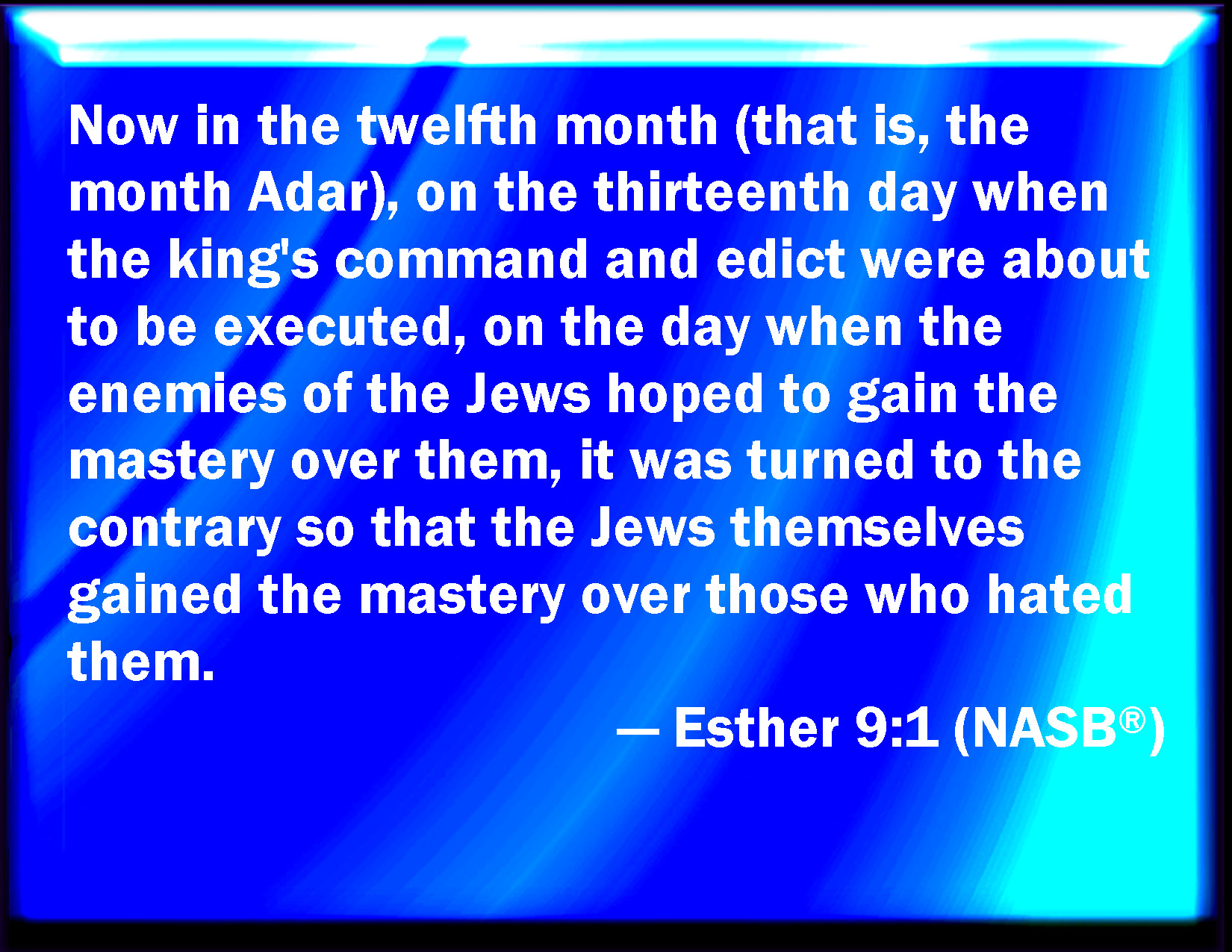 Bible Verse Slide Esther 9:1 Now in the twelfth month, that is, the month Adar, on the thirteenth day of the same, when the king's commandment and his decree drew near to be put in execution, in the day that the enemies of the Jews hoped to have power over them, (though it was turned to the contrary, that the Jews had rule over them that hated them;) KJV: Now in the twelfth month, that is, the month Adar, on the thirteenth day of the same, when the king's commandment and his decree drew near to be put in execution, in the day that the enemies of the Jews hoped to have power over them, (though it was turned to the contrary, that the Jews had rule over them that hated them;) DRB: So on the thirteenth day of the twelfth month, which as we have said above is called Adar, when all the Jews were designed to be massacred, and their enemies were greedy after their blood, the case being altered, the Jews began to have the upper hand, and to revenge themselves of their adversaries. DBT: And in the twelfth month, that is, the month Adar, on the thirteenth day thereof, when the king's commandment and his decree drew near to be put in execution, in the day that the enemies of the Jews hoped to have power over them (but it was turned to the contrary, that the Jews had power over them that hated them), ERV: Now in the twelfth month, which is the month Adar, on the thirteenth day of the same, when the king's commandment and his decree drew near to be put in execution, in the day that the enemies of the Jews hoped to have rule over them; whereas it was turned to the contrary, that the Jews had rule over them that hated them; WBT: Now in the twelfth month, that is, the month Adar, on the thirteenth day of the same, when the king's commandment and his decree drew near to be put in execution, in the day that the enemies of the Jews hoped to have power over them, (though it was turned to the contrary, that the Jews had rule over them that hated them;) WEB: Now in the twelfth month, which is the month Adar, on the thirteenth day of the month, when the king's commandment and his decree drew near to be put in execution, on the day that the enemies of the Jews hoped to conquer them, (but it was turned out the opposite happened, that the Jews conquered those who hated them), YLT: And in the twelfth month — it is the month of Adar — on the thirteenth day of it, in which the word of the king, even his law, hath come to be done, in the day that the enemies of the Jews had hoped to rule over them, and it is turned that the Jews rule over those hating them — Links Esther 9:1 NIV • Esther 9:1 NLT • Esther 9:1 ESV • Esther 9:1 NASB • Esther 9:1 KJV • Esther 9:1 Interlinear • Esther 9:1 Commentaries • Esther 9:1 Parallel Texts • Esther 9:1 Bible Apps • Esther 9:1 Parallel • Bible Hub |