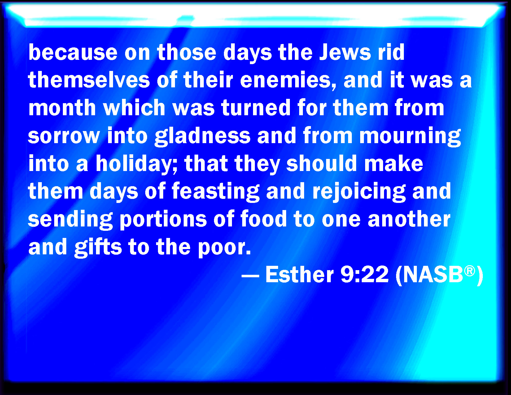Bible Verse Slide Esther 9:22 As the days wherein the Jews rested from their enemies, and the month which was turned to them from sorrow to joy, and from mourning into a good day: that they should make them days of feasting and joy, and of sending portions one to another, and gifts to the poor. KJV: As the days wherein the Jews rested from their enemies, and the month which was turned unto them from sorrow to joy, and from mourning into a good day: that they should make them days of feasting and joy, and of sending portions one to another, and gifts to the poor. DRB: Because on those days the Jews revenged themselves of their enemies, and their mourning and sorrow were turned into mirth and joy, and that these should be days of feasting and gladness, in which they should send one to another portions of meats; and should give gifts to the poor. DBT: as the days on which the Jews rested from their enemies, and the month that was turned to them from sorrow to joy, and from mourning into a good day; that they should make them days of feasting and joy, and of sending portions one to another, and gifts to the poor. ERV: as the days wherein the Jews had rest from their enemies, and the month which was turned unto them from sorrow to gladness, and from mourning into a good day: that they should make them days of feasting and gladness, and of sending portions one to another, and gifts to the poor. WBT: As the days in which the Jews rested from their enemies, and the month which was turned to them from sorrow to joy, and from mourning into a good day, that they should make them days of feasting and joy, and of sending portions one to another, and gifts to the poor. WEB: as the days in which the Jews had rest from their enemies, and the month which was turned to them from sorrow to gladness, and from mourning into a good day; that they should make them days of feasting and gladness, and of sending presents of food to one another, and gifts to the needy. YLT: as days on which the Jews have rested from their enemies, and the month that hath been turned to them from sorrow to joy, and from mourning to a good day, to make them days of banquet and of joy, and of sending portions one to another, and gifts to the needy.Links Esther 9:22 NIV • Esther 9:22 NLT • Esther 9:22 ESV • Esther 9:22 NASB • Esther 9:22 KJV • Esther 9:22 Interlinear • Esther 9:22 Commentaries • Esther 9:22 Parallel Texts • Esther 9:22 Bible Apps • Esther 9:22 Parallel • Bible Hub |