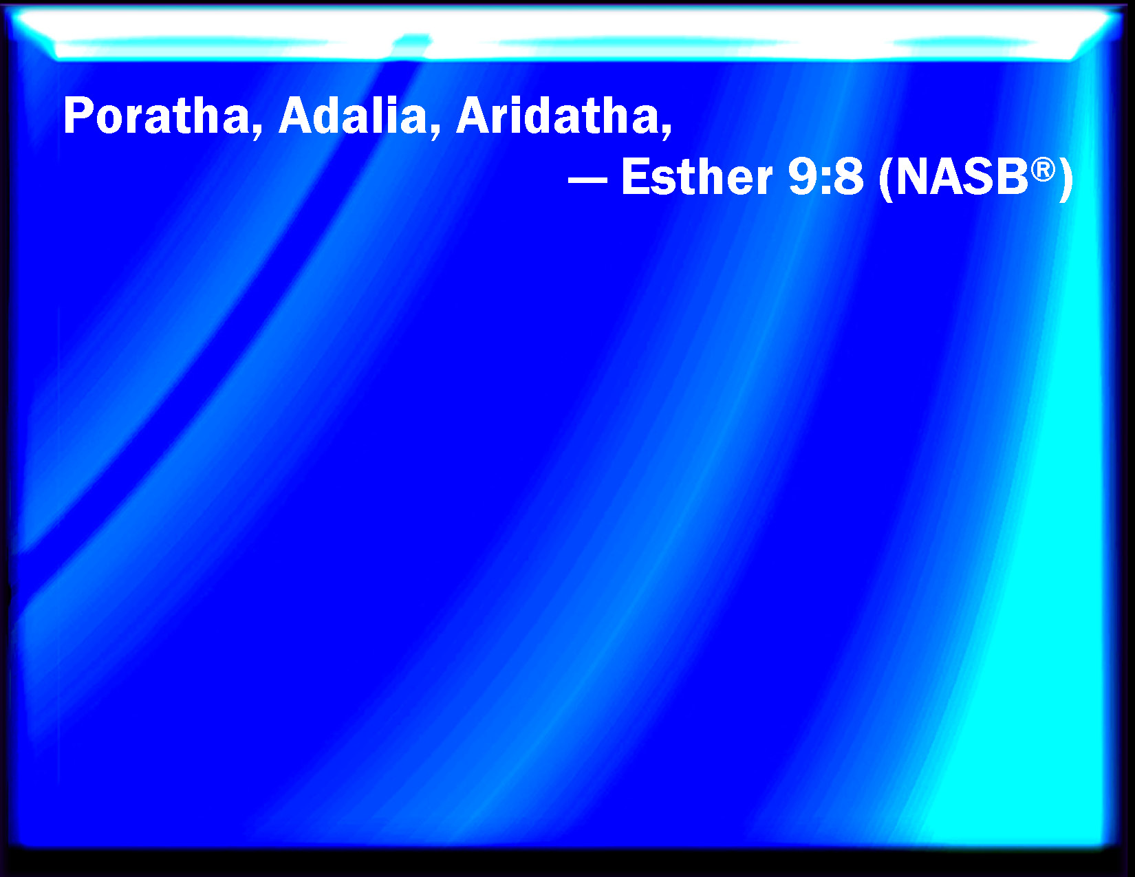 Bible Verse Slide Esther 9:8 And Poratha, and Adalia, and Aridatha, KJV: And Poratha, and Adalia, and Aridatha, DRB: And Phoratha, and Adalia, and Aridatha, DBT: and Poratha, and Adalia, and Aridatha, ERV: and Poratha, and Adalia, and Aridatha, WBT: And Poratha, and Adalia, and Aridatha, WEB: Poratha, Adalia, Aridatha, YLT: and Poratha, and Adalia, and Aridatha,Links Esther 9:8 NIV • Esther 9:8 NLT • Esther 9:8 ESV • Esther 9:8 NASB • Esther 9:8 KJV • Esther 9:8 Interlinear • Esther 9:8 Commentaries • Esther 9:8 Parallel Texts • Esther 9:8 Bible Apps • Esther 9:8 Parallel • Bible Hub |