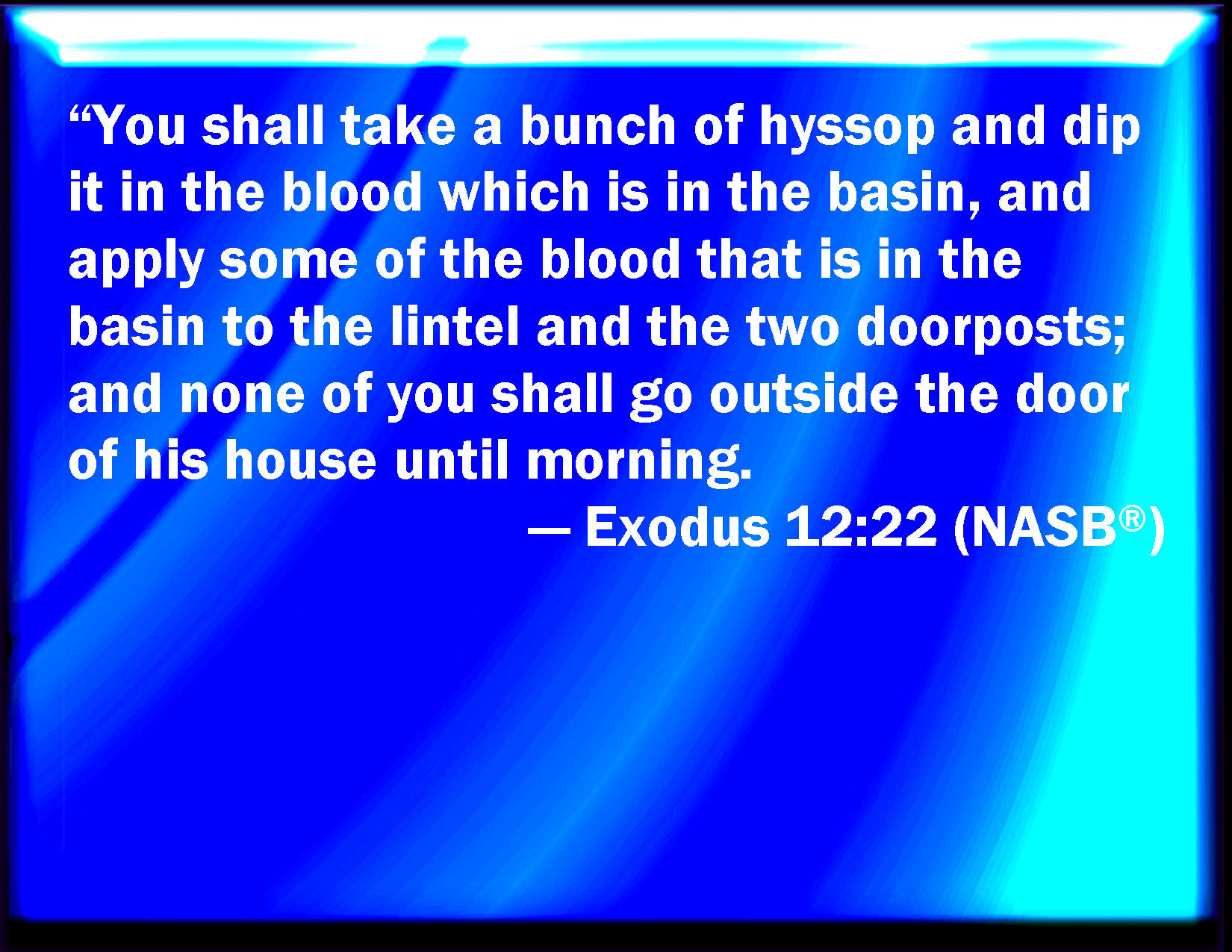 Bible Verse Slide Exodus 12:22 And you shall take a bunch of hyssop, and dip it in the blood that is in the basin, and strike the lintel and the two side posts with the blood that is in the basin; and none of you shall go out at the door of his house until the morning. KJV: And ye shall take a bunch of hyssop, and dip it in the blood that is in the bason, and strike the lintel and the two side posts with the blood that is in the bason; and none of you shall go out at the door of his house until the morning. DRB: And dip a bunch of hyssop in the blood that is at the door, and sprinkle the transom of the door therewith, and both the door cheeks: let none of you go out of the door of his house till morning. DBT: And take a bunch of hyssop, and dip it in the blood that is in the bason, and smear the lintel and the two door-posts with the blood that is in the bason; and none of you shall go out of the door of his house until the morning. ERV: And ye shall take a bunch of hyssop, and dip it in the blood that is in the bason, and strike the lintel and the two side posts with the blood that is in the bason; and none of you shall go out of the door of his house until the morning. WBT: And ye shall take a bunch of hyssop, and dip it in the blood that is in the basin, and strike the lintel and the two side-posts with the blood that is in the basin: and none of you shall go out at the door of his house till the morning. WEB: You shall take a bunch of hyssop, and dip it in the blood that is in the basin, and strike the lintel and the two doorposts with the blood that is in the basin; and none of you shall go out of the door of his house until the morning. YLT: and ye have taken a bunch of hyssop, and have dipped it in the blood which is in the basin, and have struck it on the lintel, and on the two side-posts, from the blood which is in the basin, and ye, ye go not out each from the opening of his house till morning.Links Exodus 12:22 NIV • Exodus 12:22 NLT • Exodus 12:22 ESV • Exodus 12:22 NASB • Exodus 12:22 KJV • Exodus 12:22 Interlinear • Exodus 12:22 Commentaries • Exodus 12:22 Parallel Texts • Exodus 12:22 Bible Apps • Exodus 12:22 Parallel • Bible Hub |