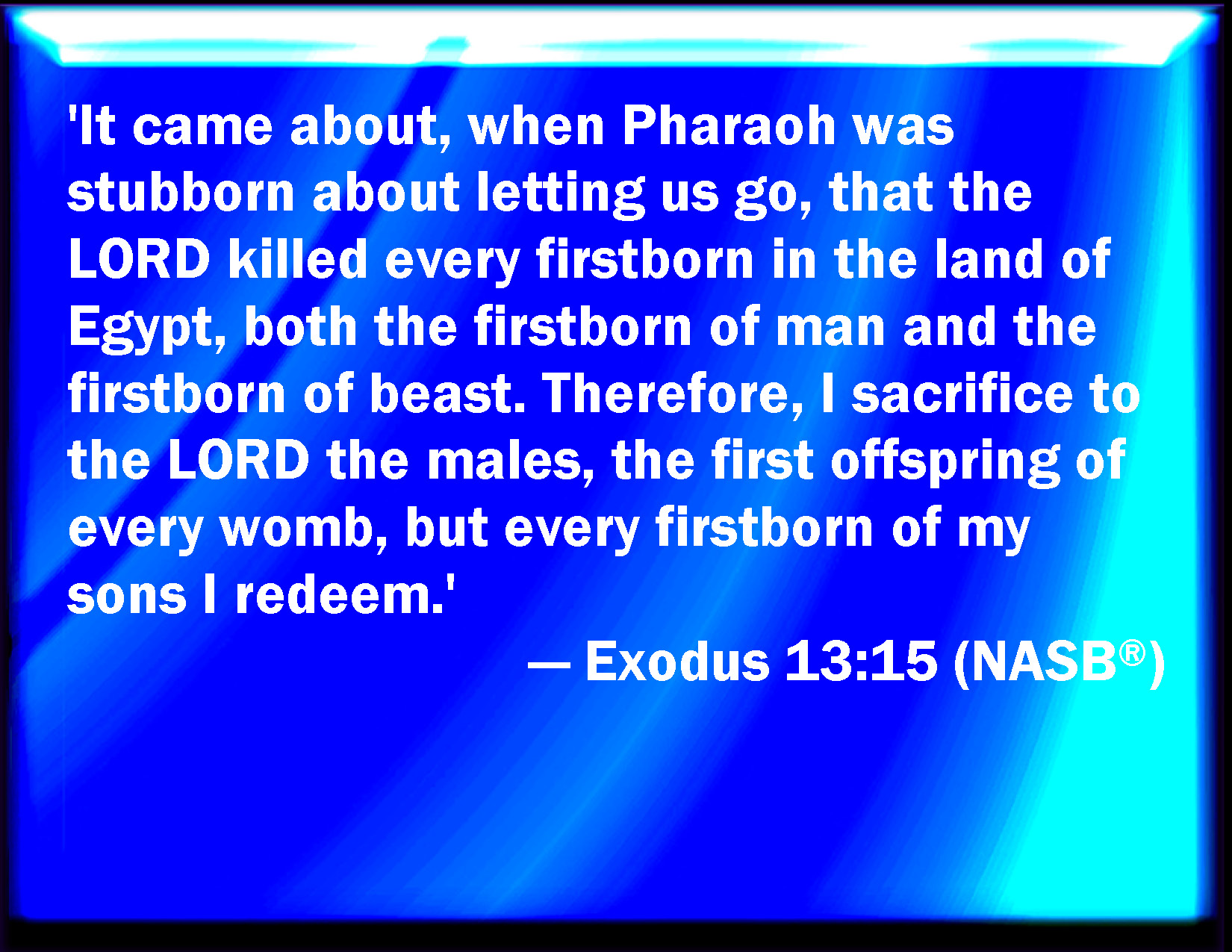 Bible Verse Slide Exodus 13:15 And it came to pass, when Pharaoh would hardly let us go, that the LORD slew all the firstborn in the land of Egypt, both the firstborn of man, and the firstborn of beast: therefore I sacrifice to the LORD all that opens the matrix, being males; but all the firstborn of my children I redeem. KJV: And it came to pass, when Pharaoh would hardly let us go, that the LORD slew all the firstborn in the land of Egypt, both the firstborn of man, and the firstborn of beast: therefore I sacrifice to the LORD all that openeth the matrix, being males; but all the firstborn of my children I redeem. DRB: For when Pharao was hardened, and would not let us go, the Lord slew every firstborn in the land of Egypt, from the firstborn of man to the firstborn of beasts: therefore I sacrifice to the Lord all that openeth the womb of the male sex, and all the firstborn of my sons I redeem. DBT: And it came to pass, when Pharaoh stubbornly refused to let us go, that Jehovah slew all the firstborn in the land of Egypt, both the firstborn of men and the firstborn of cattle: therefore I sacrifice to Jehovah all that breaketh open the womb being males; and every firstborn of my children I ransom. ERV: and it came to pass, when Pharaoh would hardly let us go, that the LORD slew all the firstborn in the land of Egypt, both the firstborn of man, and the firstborn of beast: therefore I sacrifice to the LORD all that openeth the womb, being males; but all the firstborn of my sons I redeem. WBT: And it came to pass, when Pharaoh would hardly let us go, that the LORD slew all the first-born in the land of Egypt, both the first-born of man, and the first-born of beasts: therefore I sacrifice to the LORD all that openeth the matrix, being males; but all the first-born of my children I redeem. WEB: and it happened, when Pharaoh would hardly let us go, that Yahweh killed all the firstborn in the land of Egypt, both the firstborn of man, and the firstborn of animal. Therefore I sacrifice to Yahweh all that opens the womb, being males; but all the firstborn of my sons I redeem.' YLT: yea, it cometh to pass, when Pharaoh hath been pained to send us away, that Jehovah doth slay every first-born in the land of Egypt, from the first-born of man even unto the first-born of beast; therefore I am sacrificing to Jehovah all opening a womb who are males, and every first-born of my sons I ransom;Links Exodus 13:15 NIV • Exodus 13:15 NLT • Exodus 13:15 ESV • Exodus 13:15 NASB • Exodus 13:15 KJV • Exodus 13:15 Interlinear • Exodus 13:15 Commentaries • Exodus 13:15 Parallel Texts • Exodus 13:15 Bible Apps • Exodus 13:15 Parallel • Bible Hub |