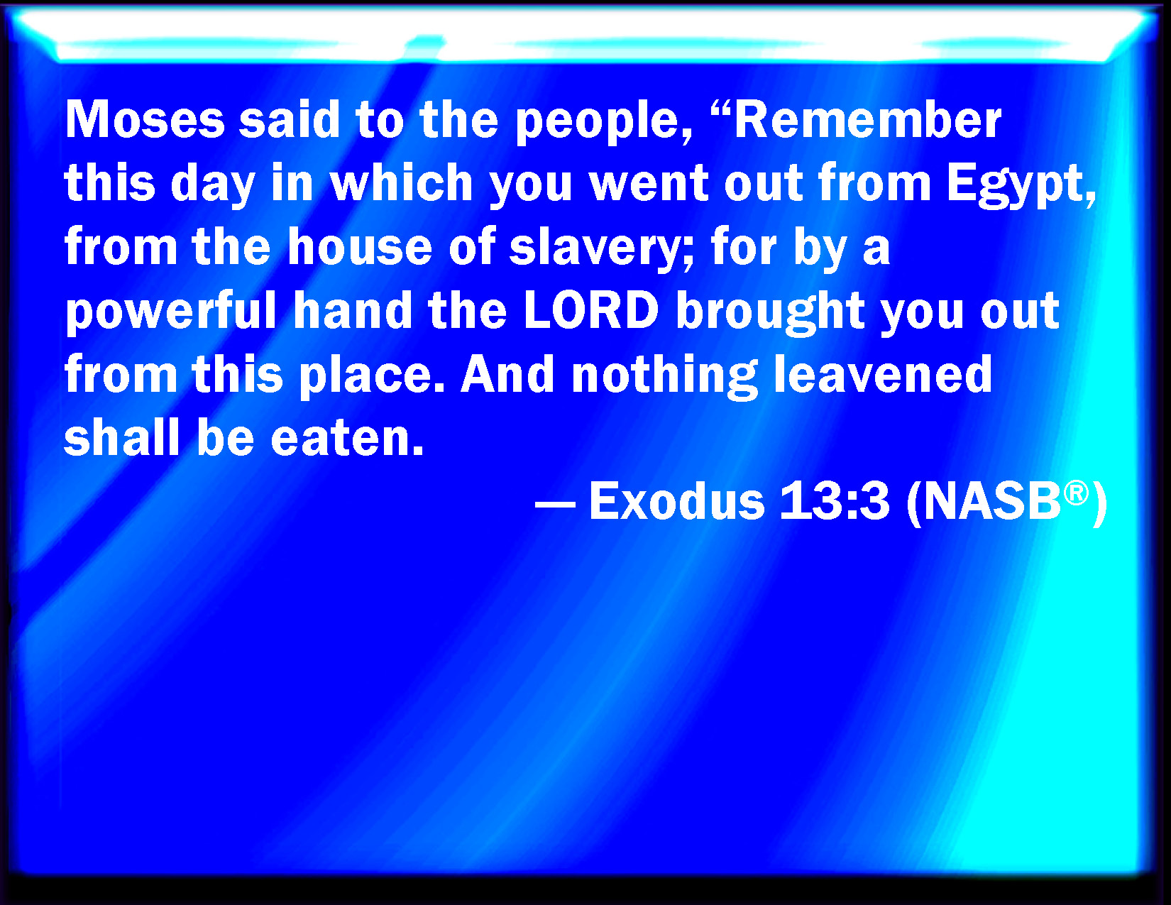 Bible Verse Slide Exodus 13:3 And Moses said to the people, Remember this day, in which you came out from Egypt, out of the house of bondage; for by strength of hand the LORD brought you out from this place: there shall no leavened bread be eaten. KJV: And Moses said unto the people, Remember this day, in which ye came out from Egypt, out of the house of bondage; for by strength of hand the LORD brought you out from this place: there shall no leavened bread be eaten. DRB: And Moses said to the people: Remember this day in which you came forth out of Egypt, and out of the house of bondage, for with a strong hand hath the Lord brought you forth out of this place: that you eat no leavened bread. DBT: And Moses said to the people, Remember this day, in which ye came out from Egypt, out of the house of bondage; for with a powerful hand hath Jehovah brought you out from this; and nothing leavened shall be eaten. ERV: And Moses said unto the people, Remember this day, in which ye came out from Egypt, out of the house of bondage; for by strength of hand the LORD brought you out from this place: there shall no leavened bread be eaten. WBT: And Moses said to the people, Remember this day, in which ye came out from Egypt, out of the house of bondage; for by strength of hand the LORD brought you out from this place: there shall no leavened bread be eaten. WEB: Moses said to the people, "Remember this day, in which you came out from Egypt, out of the house of bondage; for by strength of hand Yahweh brought you out from this place. No leavened bread shall be eaten. YLT: And Moses saith unto the people, 'Remember this day in which ye have gone out from Egypt, from the house of servants, for by strength of hand hath Jehovah brought you out from this, and any thing fermented is not eaten;Links Exodus 13:3 NIV • Exodus 13:3 NLT • Exodus 13:3 ESV • Exodus 13:3 NASB • Exodus 13:3 KJV • Exodus 13:3 Interlinear • Exodus 13:3 Commentaries • Exodus 13:3 Parallel Texts • Exodus 13:3 Bible Apps • Exodus 13:3 Parallel • Bible Hub |