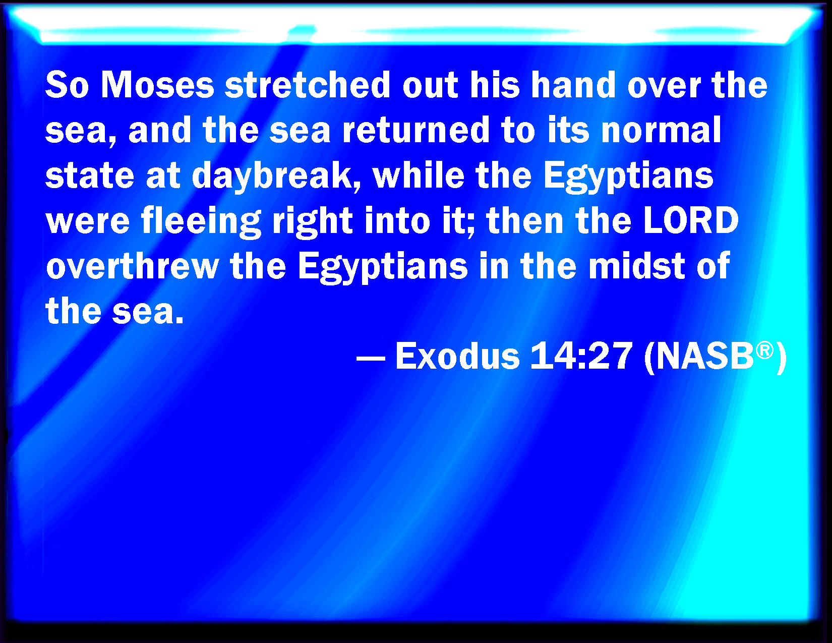 Bible Verse Slide Exodus 14:27 And Moses stretched forth his hand over the sea, and the sea returned to his strength when the morning appeared; and the Egyptians fled against it; and the LORD overthrew the Egyptians in the middle of the sea. KJV: And Moses stretched forth his hand over the sea, and the sea returned to his strength when the morning appeared; and the Egyptians fled against it; and the LORD overthrew the Egyptians in the midst of the sea. DRB: And when Moses had stretched forth his hand towards the sea, it returned at the first break of day to the former place: and as the Egyptians were fleeing away, the waters came upon them, and the Lord shut them up in the middle of the waves. DBT: And Moses stretched out his hand over the sea, and the sea returned to its strength toward the morning; and the Egyptians fled against it; and Jehovah overturned the Egyptians into the midst of the sea. ERV: And Moses stretched forth his hand over the sea, and the sea returned to its strength when the morning appeared; and the Egyptians fled against it; and the LORD overthrew the Egyptians in the midst of the sea. WBT: And Moses stretched forth his hand over the sea, and the sea returned to its strength when the morning appeared; and the Egyptians fled against it; and the LORD overthrew the Egyptians in the midst of the sea. WEB: Moses stretched out his hand over the sea, and the sea returned to its strength when the morning appeared; and the Egyptians fled against it. Yahweh overthrew the Egyptians in the midst of the sea. YLT: And Moses stretcheth out his hand towards the sea, and the sea turneth back, at the turning of the morning, to its perennial flow, and the Egyptians are fleeing at its coming, and Jehovah shaketh off the Egyptians in the midst of the sea,Links Exodus 14:27 NIV • Exodus 14:27 NLT • Exodus 14:27 ESV • Exodus 14:27 NASB • Exodus 14:27 KJV • Exodus 14:27 Interlinear • Exodus 14:27 Commentaries • Exodus 14:27 Parallel Texts • Exodus 14:27 Bible Apps • Exodus 14:27 Parallel • Bible Hub |