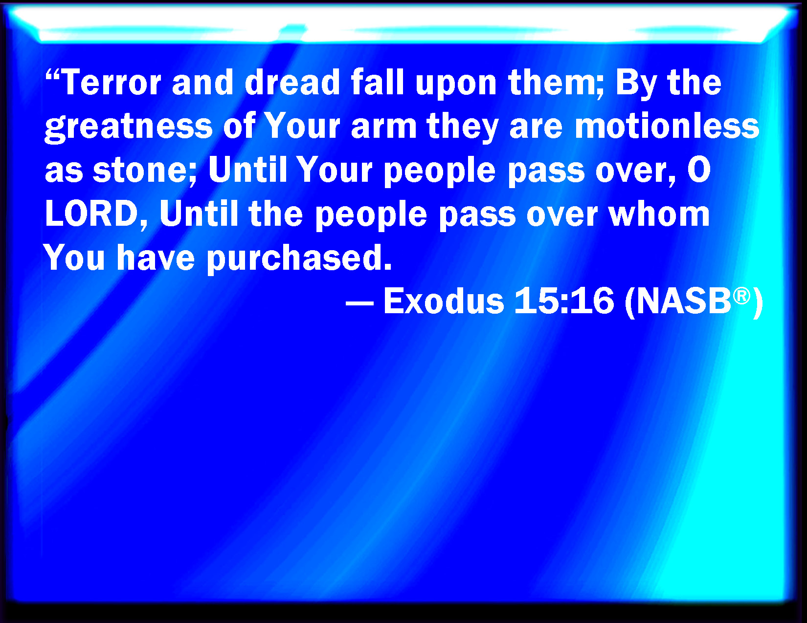 Bible Verse Slide Exodus 15:16 Fear and dread shall fall on them; by the greatness of your arm they shall be as still as a stone; till your people pass over, O LORD, till the people pass over, which you have purchased. KJV: Fear and dread shall fall upon them; by the greatness of thine arm they shall be as still as a stone; till thy people pass over, O LORD, till the people pass over, which thou hast purchased. DRB: Let fear and dread fall upon them, in the greatness of thy arm: let them become unmoveable as a stone, until thy people, O Lord, pass by: until this thy people pass by, which thou hast possessed. DBT: Fear and dread fall upon them; By the greatness of thine arm they are still as a stone; Till thy people pass over, Jehovah, Till the people pass over that thou hast purchased. ERV: Terror and dread falleth upon them; By the greatness of thine arm they are as still as a stone; Till thy people pass over, O LORD, Till the people pass over which thou hast purchased. WBT: Fear and dread shall fall upon them; by the greatness of thy arm they shall be as still as a stone; till thy people pass over, O LORD, till the people pass over, which thou hast purchased. WEB: Terror and dread falls on them. By the greatness of your arm they are as still as a stone— until your people pass over, Yahweh, until the people pass over who you have purchased. YLT: Fall on them doth terror and dread; By the greatness of Thine arm They are still as a stone, Till Thy people pass over, O Jehovah; Till the people pass over Whom Thou hast purchased.Links Exodus 15:16 NIV • Exodus 15:16 NLT • Exodus 15:16 ESV • Exodus 15:16 NASB • Exodus 15:16 KJV • Exodus 15:16 Interlinear • Exodus 15:16 Commentaries • Exodus 15:16 Parallel Texts • Exodus 15:16 Bible Apps • Exodus 15:16 Parallel • Bible Hub |
