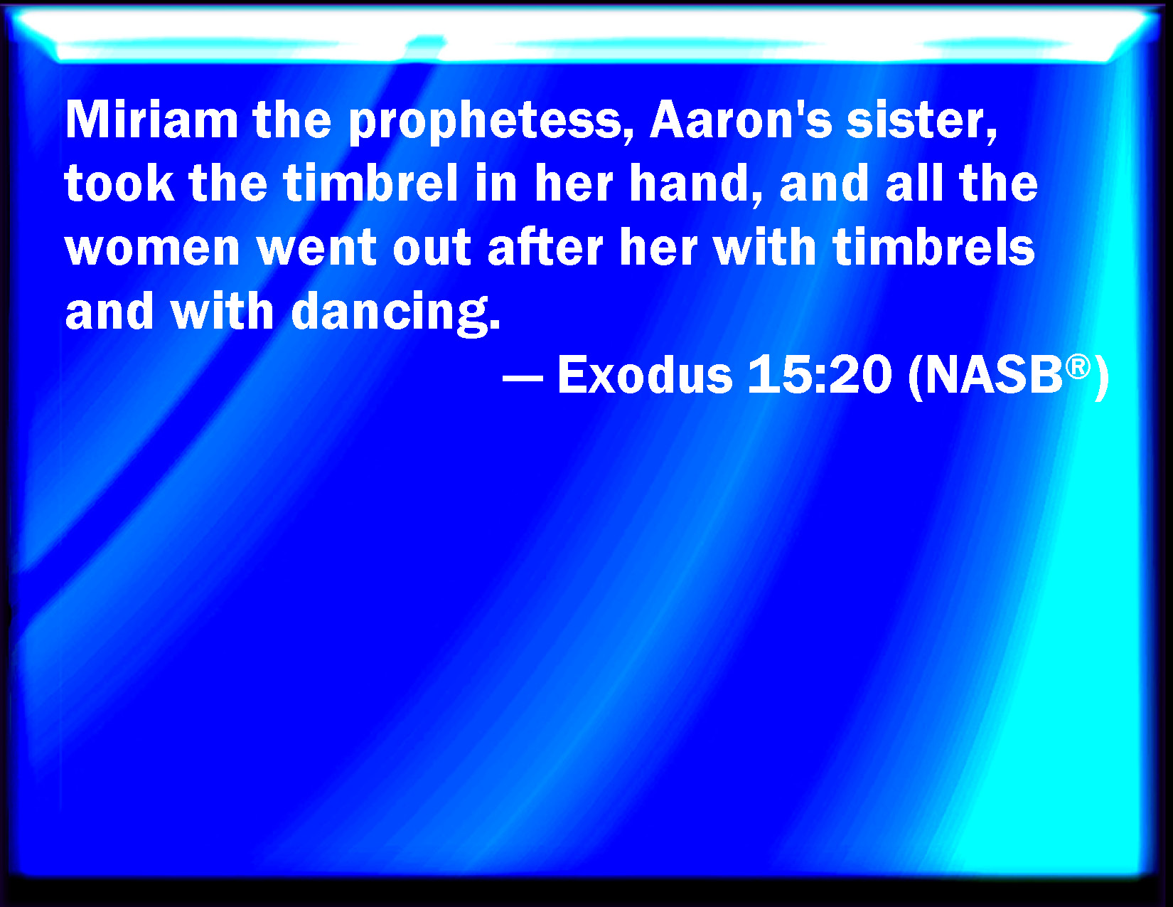 Bible Verse Slide Exodus 15:20 And Miriam the prophetess, the sister of Aaron, took a tambourine in her hand; and all the women went out after her with tambourines and with dances. KJV: And Miriam the prophetess, the sister of Aaron, took a timbrel in her hand; and all the women went out after her with timbrels and with dances. DRB: So Mary the prophetess, the sister of Aaron, took a timbrel in her hand: and all the women went forth after her with timbrels and with dances: DBT: And Miriam the prophetess, the sister of Aaron, took the tambour in her hand, and all the women went out after her with tambours and with dances. ERV: And Miriam the prophetess, the sister of Aaron, took a timbrel in her hand; and all the women went out after her with timbrels and with dances. WBT: And Miriam the prophetess, the sister of Aaron, took a timbrel in her hand; and all the women went out after her, with timbrels, and with dances. WEB: Miriam the prophetess, the sister of Aaron, took a tambourine in her hand; and all the women went out after her with tambourines and with dances. YLT: And Miriam the inspired one, sister of Aaron, taketh the timbrel in her hand, and all the women go out after her, with timbrels and with choruses;Links Exodus 15:20 NIV • Exodus 15:20 NLT • Exodus 15:20 ESV • Exodus 15:20 NASB • Exodus 15:20 KJV • Exodus 15:20 Interlinear • Exodus 15:20 Commentaries • Exodus 15:20 Parallel Texts • Exodus 15:20 Bible Apps • Exodus 15:20 Parallel • Bible Hub |