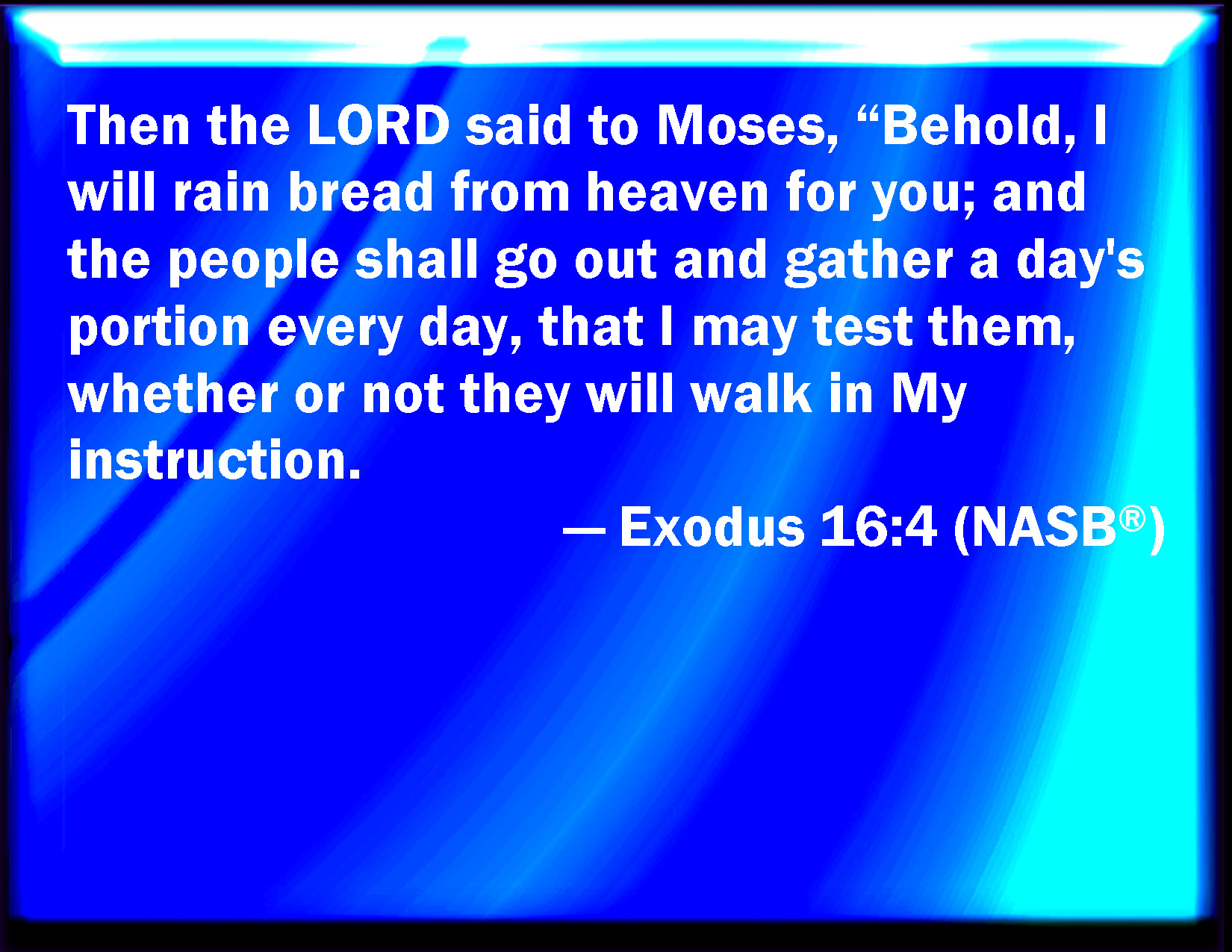 Bible Verse Slide Exodus 16:4 Then said the LORD to Moses, Behold, I will rain bread from heaven for you; and the people shall go out and gather a certain rate every day, that I may prove them, whether they will walk in my law, or no. KJV: Then said the LORD unto Moses, Behold, I will rain bread from heaven for you; and the people shall go out and gather a certain rate every day, that I may prove them, whether they will walk in my law, or no. DRB: And the Lord said to Moses: Behold I will rain bread from heaven for you: let the people go forth, and gather what is sufficient for every day: that I may prove them whether they will walk in my law, or not. DBT: Then said Jehovah to Moses, Behold, I will rain bread from heaven for you; and the people shall go out and gather the daily need on its day, that I may prove them, whether they will walk in my law, or not. ERV: Then said the LORD unto Moses, Behold, I will rain bread from heaven for you; and the people shall go out and gather a day's portion every day, that I may prove them, whether they will walk in my law, or no. WBT: Then said the LORD to Moses, Behold, I will rain bread from heaven for you; and the people shall go out and gather a certain rate every day, that I may prove them, whether they will walk in my law, or not. WEB: Then Yahweh said to Moses, "Behold, I will rain bread from the sky for you, and the people shall go out and gather a day's portion every day, that I may test them, whether they will walk in my law, or not. YLT: And Jehovah saith unto Moses, 'Lo, I am raining to you bread from the heavens — and the people have gone out and gathered the matter of a day in its day — so that I try them whether they walk in My law, or not;Links Exodus 16:4 NIV • Exodus 16:4 NLT • Exodus 16:4 ESV • Exodus 16:4 NASB • Exodus 16:4 KJV • Exodus 16:4 Interlinear • Exodus 16:4 Commentaries • Exodus 16:4 Parallel Texts • Exodus 16:4 Bible Apps • Exodus 16:4 Parallel • Bible Hub |