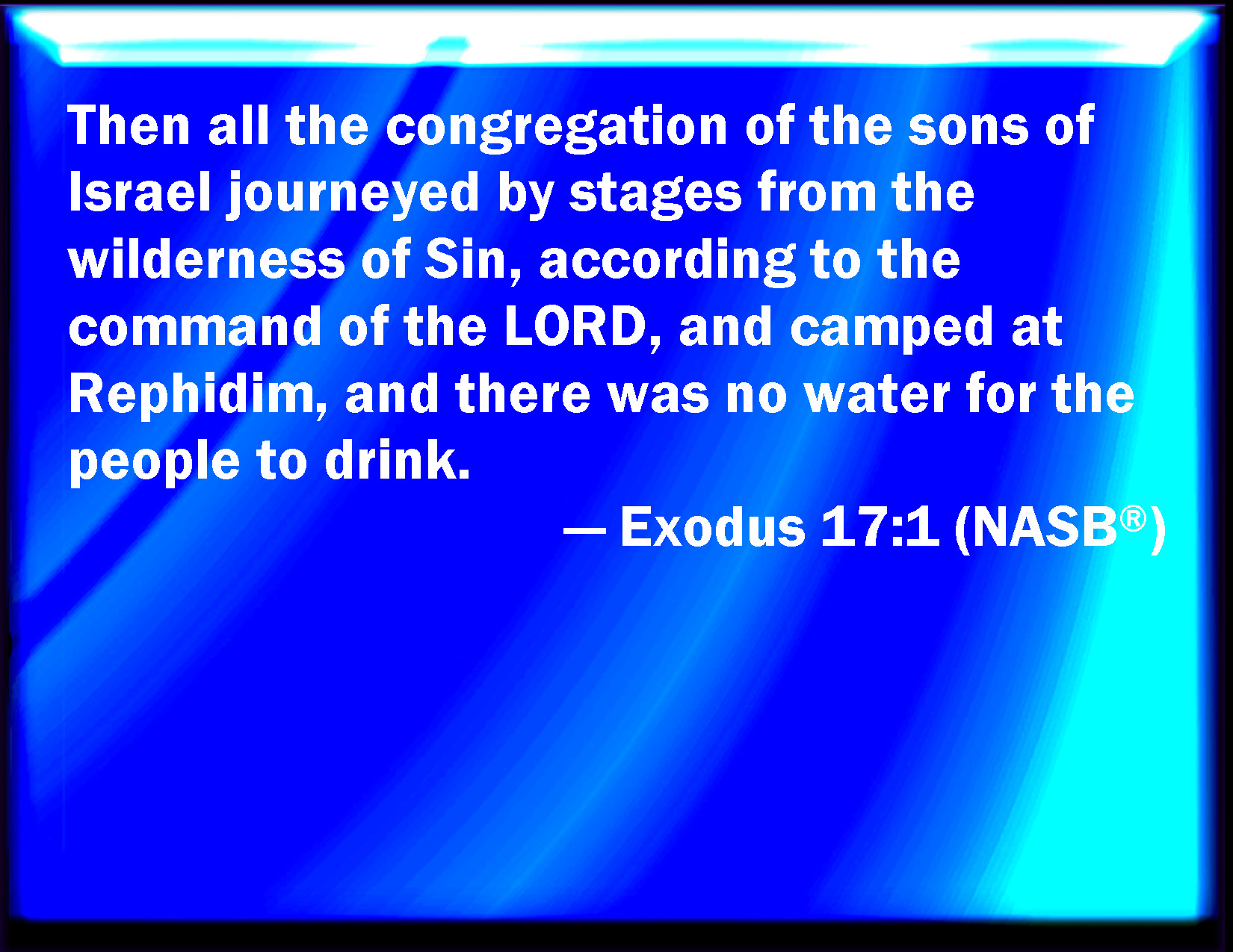 Bible Verse Slide Exodus 17:1 And all the congregation of the children of Israel journeyed from the wilderness of Sin, after their journeys, according to the commandment of the LORD, and pitched in Rephidim: and there was no water for the people to drink. KJV: And all the congregation of the children of Israel journeyed from the wilderness of Sin, after their journeys, according to the commandment of the LORD, and pitched in Rephidim: and there was no water for the people to drink. DRB: Then all the multitude of the children of Israel setting forward from the desert of Sin, by their mansions, according to the word of the Lord, encamped in Raphidim, where there was no water for the people to drink. DBT: And all the assembly of the children of Israel journeyed from the wilderness of Sin, according to their journeys, at the command of Jehovah; and they encamped in Rephidim; and there was no water for the people to drink. ERV: And all the congregation of the children of Israel journeyed from the wilderness of Sin, by their journeys, according to the commandment of the LORD, and pitched in Rephidim: and there was no water for the people to drink. WBT: And all the congregation of the children of Israel journeyed from the wilderness of Sin, after their journeys, according to the commandment of the LORD, and encamped in Rephidim: and there was no water for the people to drink. WEB: All the congregation of the children of Israel traveled from the wilderness of Sin, by their journeys, according to Yahweh's commandment, and encamped in Rephidim; but there was no water for the people to drink. YLT: And all the company of the sons of Israel journey from the wilderness of Sin, on their journeyings, by the command of Jehovah, and encamp in Rephidim, and there is no water for the people to drink;Links Exodus 17:1 NIV • Exodus 17:1 NLT • Exodus 17:1 ESV • Exodus 17:1 NASB • Exodus 17:1 KJV • Exodus 17:1 Interlinear • Exodus 17:1 Commentaries • Exodus 17:1 Parallel Texts • Exodus 17:1 Bible Apps • Exodus 17:1 Parallel • Bible Hub |