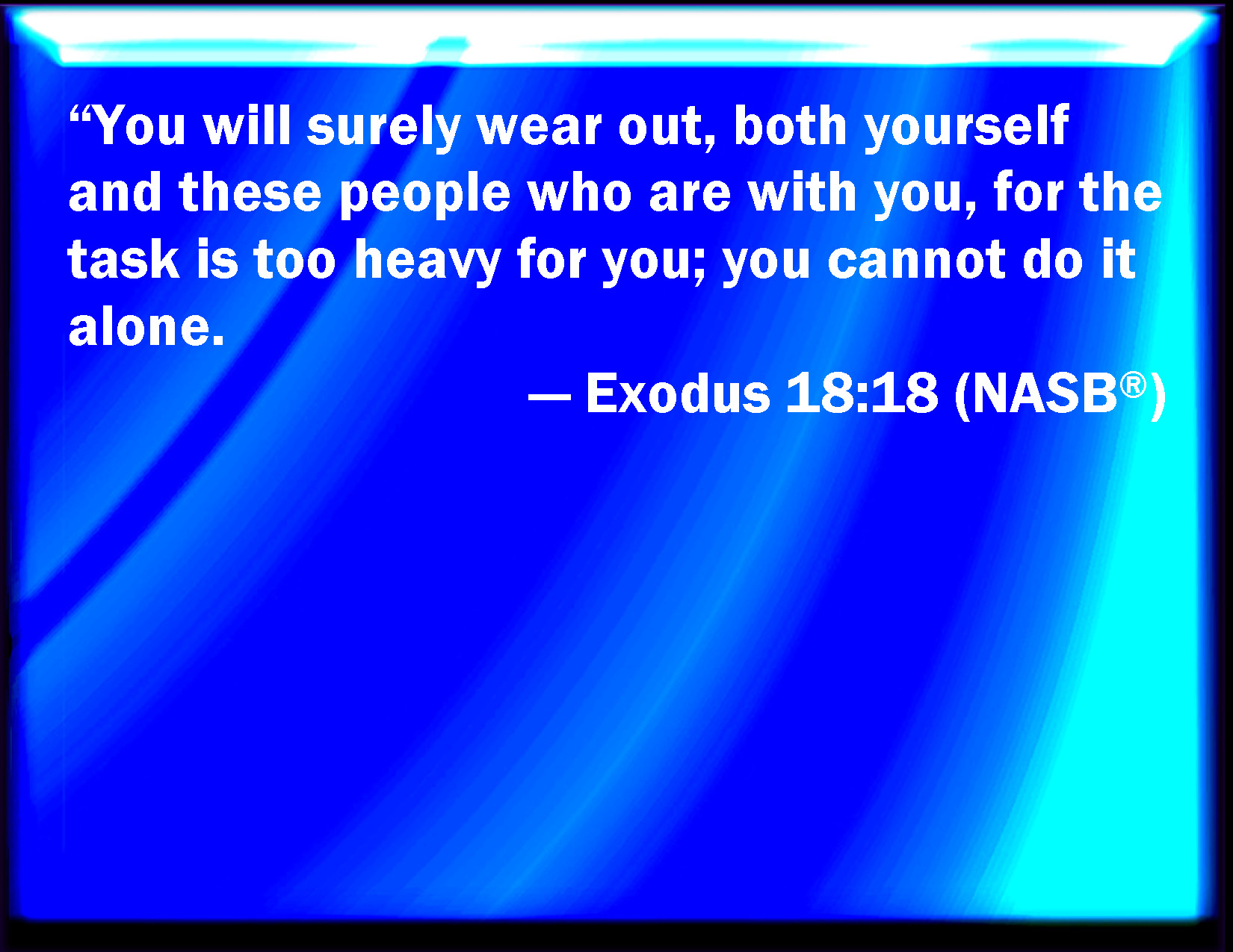 Bible Verse Slide Exodus 18:18 You will surely wear away, both you, and this people that is with you: for this thing is too heavy for you; you are not able to perform it yourself alone. KJV: Thou wilt surely wear away, both thou, and this people that is with thee: for this thing is too heavy for thee; thou art not able to perform it thyself alone. DRB: Thou are spent with foolish labour, both thou and this people that is with thee: the business is above thy strength, thou alone canst not bear it. DBT: Thou wilt be quite exhausted, both thou and this people that is with thee; for the thing is too heavy for thee: thou canst not perform it alone. ERV: Thou wilt surely wear away, both thou, and this people that is with thee: for the thing is too heavy for thee; thou art not able to perform it thyself alone. WBT: Thou wilt surely wear away, both thou, and this people that is with thee: for this thing is too heavy for thee; thou art not able to perform it thyself alone. WEB: You will surely wear away, both you, and this people that is with you; for the thing is too heavy for you. You are not able to perform it yourself alone. YLT: thou dost surely wear away, both thou, and this people which is with thee, for the thing is too heavy for thee, thou art not able to do it by thyself.Links Exodus 18:18 NIV • Exodus 18:18 NLT • Exodus 18:18 ESV • Exodus 18:18 NASB • Exodus 18:18 KJV • Exodus 18:18 Interlinear • Exodus 18:18 Commentaries • Exodus 18:18 Parallel Texts • Exodus 18:18 Bible Apps • Exodus 18:18 Parallel • Bible Hub |