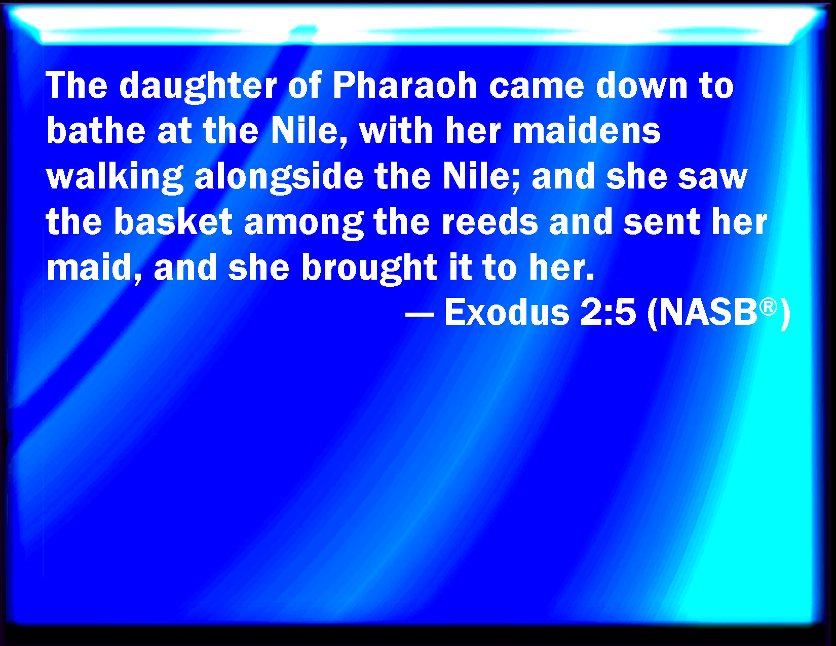 Bible Verse Slide Exodus 2:5 And the daughter of Pharaoh came down to wash herself at the river; and her maidens walked along by the river's side; and when she saw the ark among the flags, she sent her maid to fetch it. KJV: And the daughter of Pharaoh came down to wash herself at the river; and her maidens walked along by the river's side; and when she saw the ark among the flags, she sent her maid to fetch it. DRB: And behold the daughter of Pharao came down to wash herself in the river: and her maids walked by the river's brink. And when she saw the basket in the sedges, she sent one of her maids for it: and when it was brought, DBT: And the daughter of Pharaoh went down to bathe in the river; and her maids went along by the river's side. And she saw the ark in the midst of the sedge, and sent her handmaid and fetched it. ERV: And the daughter of Pharaoh came down to bathe at the river; and her maidens walked along by the river side; and she saw the ark among the flags, and sent her handmaid to fetch it. WBT: And the daughter of Pharaoh came down to wash herself at the river, and her maidens walked along by the river's side: and when she saw the ark among the flags, she sent her maid to fetch it. WEB: Pharaoh's daughter came down to bathe at the river. Her maidens walked along by the riverside. She saw the basket among the reeds, and sent her handmaid to get it. YLT: And a daughter of Pharaoh cometh down to bathe at the River, and her damsels are walking by the side of the River, and she seeth the ark in the midst of the weeds, and sendeth her handmaid, and she taketh it,Links Exodus 2:5 NIV • Exodus 2:5 NLT • Exodus 2:5 ESV • Exodus 2:5 NASB • Exodus 2:5 KJV • Exodus 2:5 Interlinear • Exodus 2:5 Commentaries • Exodus 2:5 Parallel Texts • Exodus 2:5 Bible Apps • Exodus 2:5 Parallel • Bible Hub |