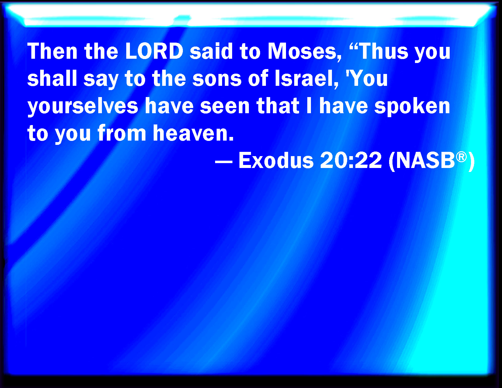 Bible Verse Slide Exodus 20:22 And the LORD said to Moses, Thus you shall say to the children of Israel, You have seen that I have talked with you from heaven. KJV: And the LORD said unto Moses, Thus thou shalt say unto the children of Israel, Ye have seen that I have talked with you from heaven. DRB: And the Lord said to Moses: Thus shalt thou say to the children of Israel: You have seen that I have spoken to you from heaven. DBT: And Jehovah said to Moses, Thus shalt thou say to the children of Israel: Ye have seen that I have spoken with you from the heavens. ERV: And the LORD said unto Moses, Thus thou shalt say unto the children of Israel, Ye yourselves have seen that I have talked with you from heaven. WBT: And the LORD said to Moses, Thus thou shalt say to the children of Israel; Ye have seen that I have talked with you from heaven. WEB: Yahweh said to Moses, "This is what you shall tell the children of Israel: 'You yourselves have seen that I have talked with you from heaven. YLT: And Jehovah saith unto Moses, 'Thus dost thou say unto the sons of Israel: Ye — ye have seen that from the heavens I have spoken with you;Links Exodus 20:22 NIV • Exodus 20:22 NLT • Exodus 20:22 ESV • Exodus 20:22 NASB • Exodus 20:22 KJV • Exodus 20:22 Interlinear • Exodus 20:22 Commentaries • Exodus 20:22 Parallel Texts • Exodus 20:22 Bible Apps • Exodus 20:22 Parallel • Bible Hub |