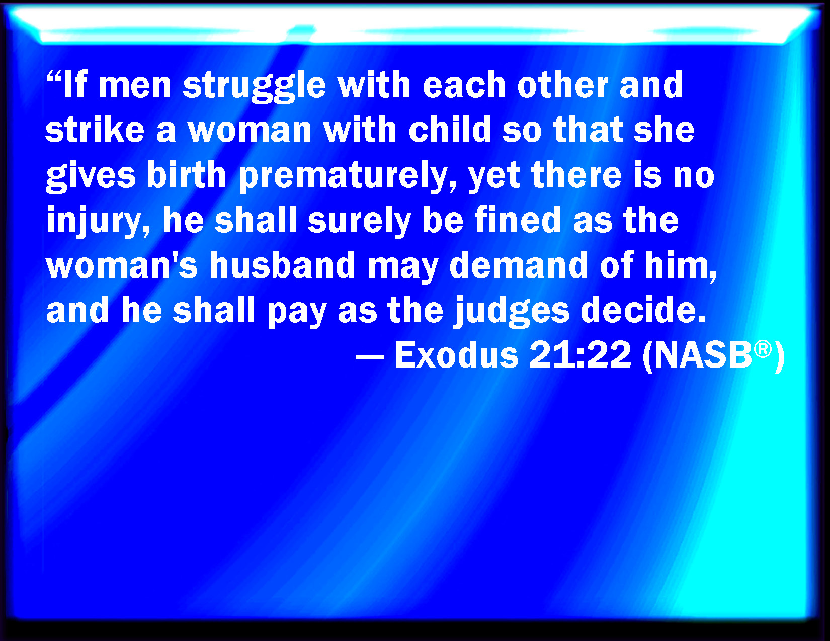 Bible Verse Slide Exodus 21:22 If men strive, and hurt a woman with child, so that her fruit depart from her, and yet no mischief follow: he shall be surely punished, according as the woman's husband will lay on him; and he shall pay as the judges determine. KJV: If men strive, and hurt a woman with child, so that her fruit depart from her, and yet no mischief follow: he shall be surely punished, according as the woman's husband will lay upon him; and he shall pay as the judges determine. DRB: If men quarrel, and one strike a woman with child, and she miscarry indeed, but live herself: he shall be answerable for so much damage as the woman's husband shall require, and as arbiters shall award. DBT: And if men strive together, and strike a woman with child, so that she be delivered, and no mischief happen, he shall in any case be fined, according as the woman's husband shall impose on him, and shall give it as the judges estimate. ERV: And if men strive together, and hurt a woman with child, so that her fruit depart, and yet no mischief follow: he shall be surely fined, according as the woman's husband shall lay upon him; and he shall pay as the judges determine. WBT: If men shall contend, and hurt a woman with child, so that her fruit shall depart from her, and yet no mischief follow: he shall be surely punished, according as the woman's husband will lay upon him; and he shall pay as the judges determine. WEB: "If men fight and hurt a pregnant woman so that she gives birth prematurely, and yet no harm follows, he shall be surely fined as much as the woman's husband demands and the judges allow. YLT: 'And when men strive, and have smitten a pregnant woman, and her children have come out, and there is no mischief, he is certainly fined, as the husband of the woman doth lay upon him, and he hath given through the judges;Links Exodus 21:22 NIV • Exodus 21:22 NLT • Exodus 21:22 ESV • Exodus 21:22 NASB • Exodus 21:22 KJV • Exodus 21:22 Interlinear • Exodus 21:22 Commentaries • Exodus 21:22 Parallel Texts • Exodus 21:22 Bible Apps • Exodus 21:22 Parallel • Bible Hub |