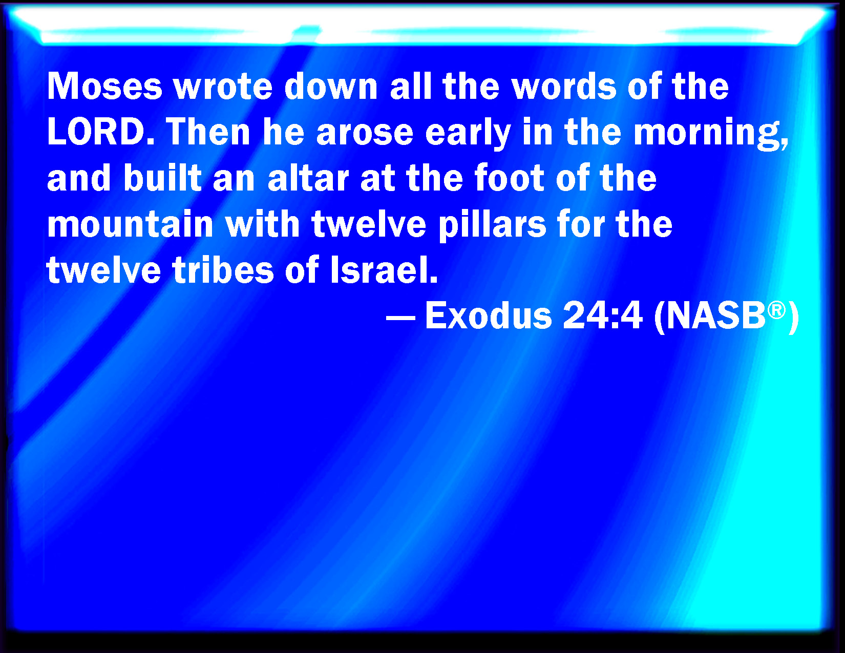 Bible Verse Slide Exodus 24:4 And Moses wrote all the words of the LORD, and rose up early in the morning, and built an altar under the hill, and twelve pillars, according to the twelve tribes of Israel. KJV: And Moses wrote all the words of the LORD, and rose up early in the morning, and builded an altar under the hill, and twelve pillars, according to the twelve tribes of Israel. DRB: And Moses wrote all the words of the Lord: and rising in the morning he built an altar at the foot of the mount, and twelve titles according to the twelve tribes of Israel. DBT: And Moses wrote all the words of Jehovah, and rose up early in the morning, and built an altar under the mountain, and twelve pillars, according to the twelve tribes of Israel. ERV: And Moses wrote all the words of the LORD, and rose up early in the morning, and builded an altar under the mount, and twelve pillars, according to the twelve tribes of Israel. WBT: And Moses wrote all the words of the LORD, and rose early in the morning, and built an altar under the hill, and twelve pillars according to the twelve tribes of Israel. WEB: Moses wrote all the words of Yahweh, and rose up early in the morning, and built an altar under the mountain, and twelve pillars for the twelve tribes of Israel. YLT: And Moses writeth all the words of Jehovah, and riseth early in the morning, and buildeth an altar under the hill, and twelve standing pillars for the twelve tribes of Israel;Links Exodus 24:4 NIV • Exodus 24:4 NLT • Exodus 24:4 ESV • Exodus 24:4 NASB • Exodus 24:4 KJV • Exodus 24:4 Interlinear • Exodus 24:4 Commentaries • Exodus 24:4 Parallel Texts • Exodus 24:4 Bible Apps • Exodus 24:4 Parallel • Bible Hub |