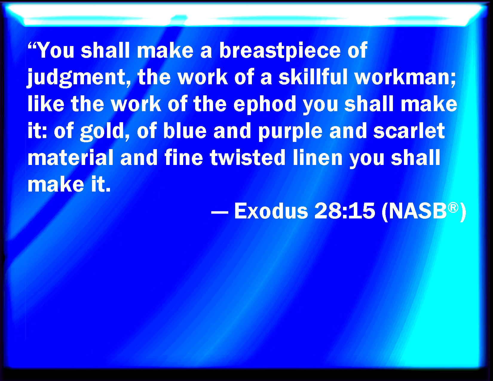 Bible Verse Slide Exodus 28:15 And you shall make the breastplate of judgment with cunning work; after the work of the ephod you shall make it; of gold, of blue, and of purple, and of scarlet, and of fine twined linen, shall you make it. KJV: And thou shalt make the breastplate of judgment with cunning work; after the work of the ephod thou shalt make it; of gold, of blue, and of purple, and of scarlet, and of fine twined linen, shalt thou make it. DRB: And thou shalt make the rational of judgment with embroidered work of divers colours, according to the workmanship of the ephod, of gold, violet, and purple, and scarlet twice dyed, and fine twisted linen. DBT: And thou shalt make the breastplate of judgment of artistic work, like the work of the ephod thou shalt make it; of gold, blue, and purple, and scarlet, and twined byssus shalt thou make it. ERV: And thou shalt make a breastplate of judgment, the work of the cunning workman; like the work of the ephod thou shalt make it; of gold, of blue, and purple, and scarlet, and fine twined linen, shalt thou make it. WBT: And thou shalt make the breast-plate of judgment with curious work; after the work of the ephod thou shalt make it; of gold, of blue, and of purple, and of scarlet, and of fine twined linen shalt thou make it. WEB: "You shall make a breastplate of judgment, the work of the skillful workman; like the work of the ephod you shall make it; of gold, of blue, and purple, and scarlet, and fine twined linen, you shall make it. YLT: 'And thou hast made a breastplate of judgment, work of a designer; according to the work of the ephod thou dost make it; of gold, blue, and purple, and scarlet, and twined linen thou dost make it;Links Exodus 28:15 NIV • Exodus 28:15 NLT • Exodus 28:15 ESV • Exodus 28:15 NASB • Exodus 28:15 KJV • Exodus 28:15 Interlinear • Exodus 28:15 Commentaries • Exodus 28:15 Parallel Texts • Exodus 28:15 Bible Apps • Exodus 28:15 Parallel • Bible Hub |