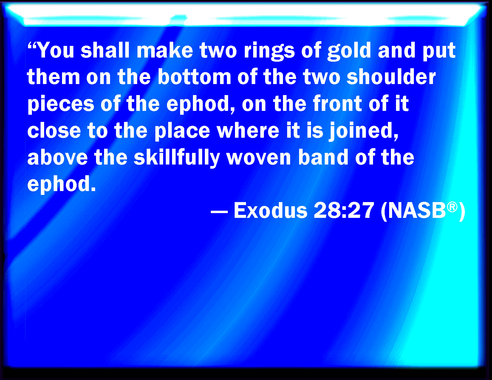 Bible Verse Slide Exodus 28:27 And two other rings of gold you shall make, and shall put them on the two sides of the ephod underneath, toward the forepart thereof, over against the other coupling thereof, above the curious girdle of the ephod. KJV: And two other rings of gold thou shalt make, and shalt put them on the two sides of the ephod underneath, toward the forepart thereof, over against the other coupling thereof, above the curious girdle of the ephod. DRB: Moreover also other two rings of gold, which are to be set on each side of the ephod beneath, that looketh towards the nether joining, that the rational may be fitted with the ephod, DBT: And two rings of gold shalt thou make, and shalt put them upon the two shoulder-pieces of the ephod underneath, to the front thereof just by the coupling thereof, above the girdle of the ephod. ERV: And thou shalt make two rings of gold, and shalt put them on the two shoulderpieces of the ephod underneath, in the forepart thereof, close by the coupling thereof, above the cunningly woven band of the ephod. WBT: And two other rings of gold thou shalt make, and shalt put them on the two sides of the ephod underneath, towards the forepart of it, over against the other coupling thereof, above the curious girdle of the ephod. WEB: You shall make two rings of gold, and shall put them on the two shoulder straps of the ephod underneath, in its forepart, close by its coupling, above the skillfully woven band of the ephod. YLT: and thou hast made two rings of gold, and hast put them on the two shoulders of the ephod, beneath, over-against its front, over-against its joining, above the girdle of the ephod,Links Exodus 28:27 NIV • Exodus 28:27 NLT • Exodus 28:27 ESV • Exodus 28:27 NASB • Exodus 28:27 KJV • Exodus 28:27 Interlinear • Exodus 28:27 Commentaries • Exodus 28:27 Parallel Texts • Exodus 28:27 Bible Apps • Exodus 28:27 Parallel • Bible Hub |