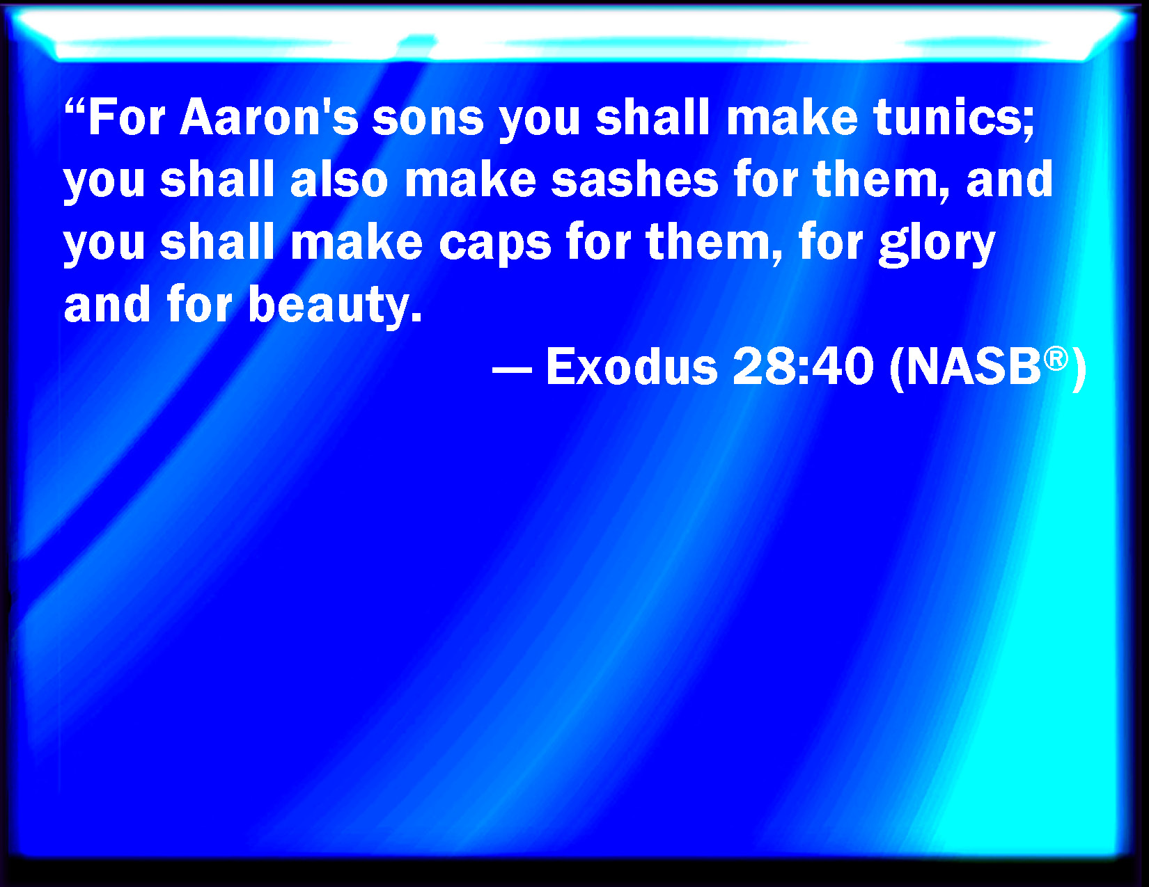 Bible Verse Slide Exodus 28:40 And for Aaron's sons you shall make coats, and you shall make for them girdles, and bonnets shall you make for them, for glory and for beauty. KJV: And for Aaron's sons thou shalt make coats, and thou shalt make for them girdles, and bonnets shalt thou make for them, for glory and for beauty. DRB: Moreover for the sons of Aaron thou shalt prepare linen tunicks, and girdles and mitres for glory and beauty: DBT: And for Aaron's sons thou shalt make vests; and thou shalt make for them girdles; and high caps shalt thou make for them, for glory and for ornament. ERV: And for Aaron's sons thou shalt make coats, and thou shalt make for them girdles, and headtires shalt thou make for them, for glory and for beauty. WBT: And for Aaron's sons thou shalt make coats, and thou shalt make for them girdles, and bonnets shalt thou make for them, for glory and for beauty. WEB: "You shall make coats for Aaron's sons, and you shall make sashes for them and you shall make headbands for them, for glory and for beauty. YLT: 'And for the sons of Aaron thou dost make coats, and thou hast made for them girdles, yea, bonnets thou dost make for them, for honour and for beauty;Links Exodus 28:40 NIV • Exodus 28:40 NLT • Exodus 28:40 ESV • Exodus 28:40 NASB • Exodus 28:40 KJV • Exodus 28:40 Interlinear • Exodus 28:40 Commentaries • Exodus 28:40 Parallel Texts • Exodus 28:40 Bible Apps • Exodus 28:40 Parallel • Bible Hub |