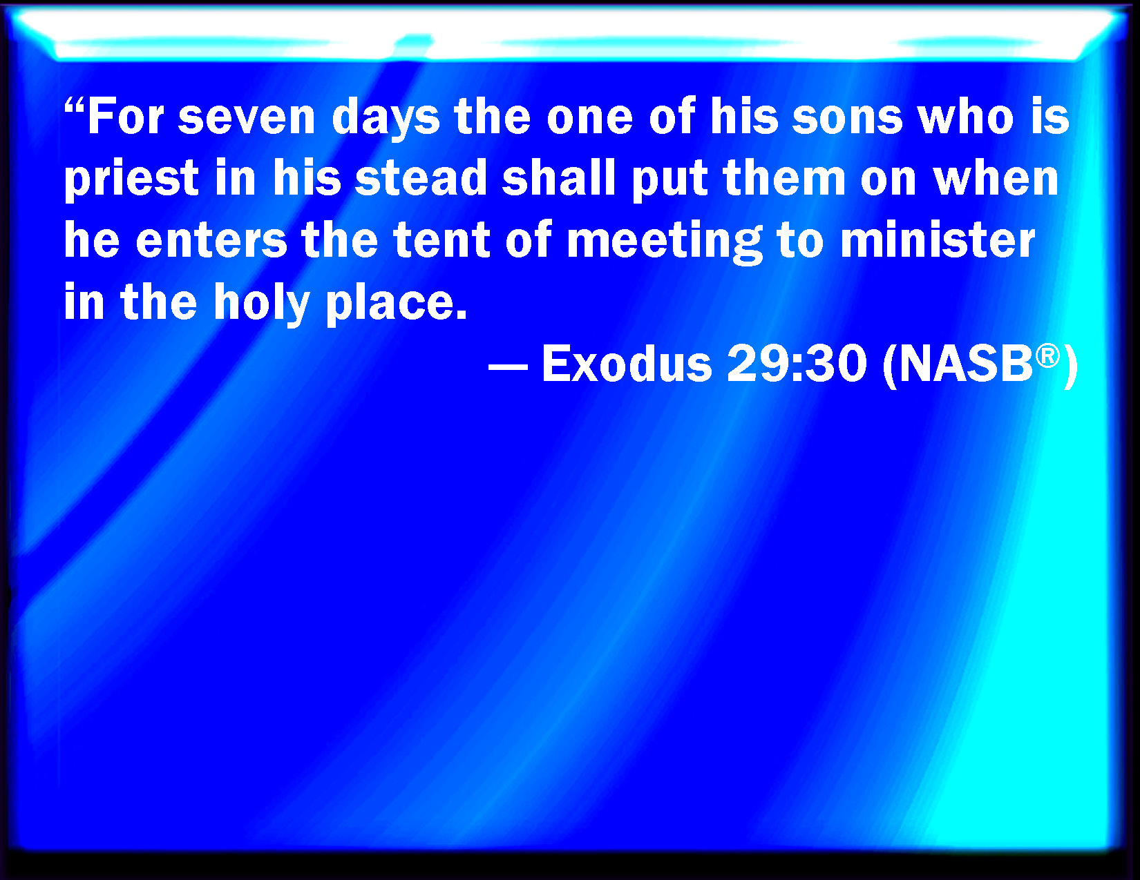 Bible Verse Slide Exodus 29:30 And that son that is priest in his stead shall put them on seven days, when he comes into the tabernacle of the congregation to minister in the holy place. KJV: And that son that is priest in his stead shall put them on seven days, when he cometh into the tabernacle of the congregation to minister in the holy place. DRB: He of his sons that shall be appointed high priest in his stead, and that shall enter into the tabernacle of the testimony to minister in the sanctuary, shall wear it seven days. DBT: The son that is priest in his stead shall put them on seven days, when he cometh into the tent of meeting to serve in the sanctuary. ERV: Seven days shall the son that is priest in his stead put them on, when he cometh into the tent of meeting to minister in the holy place. WBT: And that son, that is priest in his stead, shall put them on seven days, when he cometh into the tabernacle of the congregation to minister in the holy place. WEB: Seven days shall the son who is priest in his place put them on, when he comes into the Tent of Meeting to minister in the holy place. YLT: seven days doth the priest in his stead (of his sons) put them on, when he goeth in unto the tent of meeting, to minister in the sanctuary.Links Exodus 29:30 NIV • Exodus 29:30 NLT • Exodus 29:30 ESV • Exodus 29:30 NASB • Exodus 29:30 KJV • Exodus 29:30 Interlinear • Exodus 29:30 Commentaries • Exodus 29:30 Parallel Texts • Exodus 29:30 Bible Apps • Exodus 29:30 Parallel • Bible Hub |