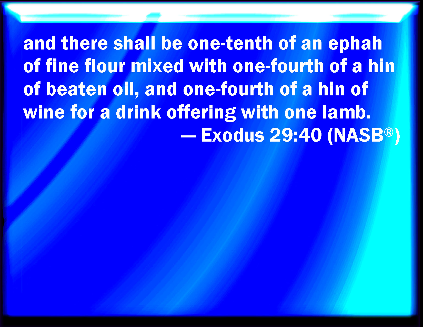 Bible Verse Slide Exodus 29:40 And with the one lamb a tenth deal of flour mingled with the fourth part of an hin of beaten oil; and the fourth part of an hin of wine for a drink offering. KJV: And with the one lamb a tenth deal of flour mingled with the fourth part of an hin of beaten oil; and the fourth part of an hin of wine for a drink offering. DRB: With one lamb a tenth part of flour tempered with beaten oil, of the fourth part of a hin, and wine for libation of the same measure. DBT: And with the one lamb a tenth part of wheaten flour mingled with beaten oil, a fourth part of a hin; and a drink-offering, a fourth part of a hin of wine. ERV: and with the one lamb a tenth part of an ephah of fine flour mingled with the fourth part of an hin of beaten oil; and the fourth part of an hin of wine for a drink offering. WBT: And with the one lamb a tenth-portion of flour mingled with the fourth part of a hin of beaten oil; and the fourth part of a hin of wine for a drink-offering. WEB: and with the one lamb a tenth part of an ephah of fine flour mixed with the fourth part of a hin of beaten oil, and the fourth part of a hin of wine for a drink offering. YLT: and a tenth deal of fine flour, mixed with beaten oil, a fourth part of a hin, and a libation, a fourth part of a hin, of wine, is for the one lamb.Links Exodus 29:40 NIV • Exodus 29:40 NLT • Exodus 29:40 ESV • Exodus 29:40 NASB • Exodus 29:40 KJV • Exodus 29:40 Interlinear • Exodus 29:40 Commentaries • Exodus 29:40 Parallel Texts • Exodus 29:40 Bible Apps • Exodus 29:40 Parallel • Bible Hub |
