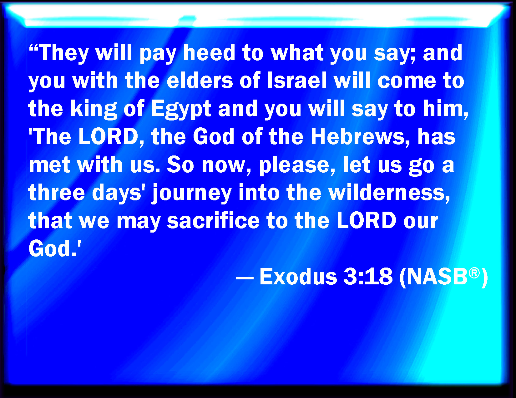 Bible Verse Slide Exodus 3:18 And they shall listen to your voice: and you shall come, you and the elders of Israel, to the king of Egypt, and you shall say to him, The LORD God of the Hebrews has met with us: and now let us go, we beseech you, three days' journey into the wilderness, that we may sacrifice to the LORD our God. KJV: And they shall hearken to thy voice: and thou shalt come, thou and the elders of Israel, unto the king of Egypt, and ye shall say unto him, The LORD God of the Hebrews hath met with us: and now let us go, we beseech thee, three days' journey into the wilderness, that we may sacrifice to the LORD our God. DRB: And they shall hear thy voice: and thou shalt go in, thou and the ancients of Israel, to the king of Egypt, and thou shalt say to him: The Lord God of the Hebrews hath called us: we will go three days' journey into the wilderness, to sacrifice unto the Lord our God. DBT: And they shall hearken to thy voice. And thou shalt come, thou and the elders of Israel, unto the king of Egypt, and ye shall say unto him, Jehovah, the God of the Hebrews, hath met with us; and now, let us go, we pray thee, three days' journey into the wilderness, that we may sacrifice to Jehovah our God. ERV: And they shall hearken to thy voice: and thou shalt come, thou and the elders of Israel, unto the king of Egypt, and ye shall say unto him, The LORD, the God of the Hebrews, hath met with us: and now let us go, we pray thee, three days' journey into the wilderness, that we may sacrifice to the LORD our God. WBT: And they shall hearken to thy voice: and thou shalt come, thou and the elders of Israel, to the king of Egypt, and ye shall say to him, The LORD God of the Hebrews hath met with us: and now let us go (we beseech thee) three days journey into the wilderness, that we may sacrifice to the LORD our God. WEB: They will listen to your voice, and you shall come, you and the elders of Israel, to the king of Egypt, and you shall tell him, 'Yahweh, the God of the Hebrews, has met with us. Now please let us go three days' journey into the wilderness, that we may sacrifice to Yahweh, our God.' YLT: 'And they have hearkened to thy voice, and thou hast entered, thou and the elders of Israel, unto the king of Egypt, and ye have said unto him, Jehovah, God of the Hebrews, hath met with us; and now, let us go, we pray thee, a journey of three days into the wilderness, and we sacrifice to Jehovah our God.Links Exodus 3:18 NIV • Exodus 3:18 NLT • Exodus 3:18 ESV • Exodus 3:18 NASB • Exodus 3:18 KJV • Exodus 3:18 Interlinear • Exodus 3:18 Commentaries • Exodus 3:18 Parallel Texts • Exodus 3:18 Bible Apps • Exodus 3:18 Parallel • Bible Hub |