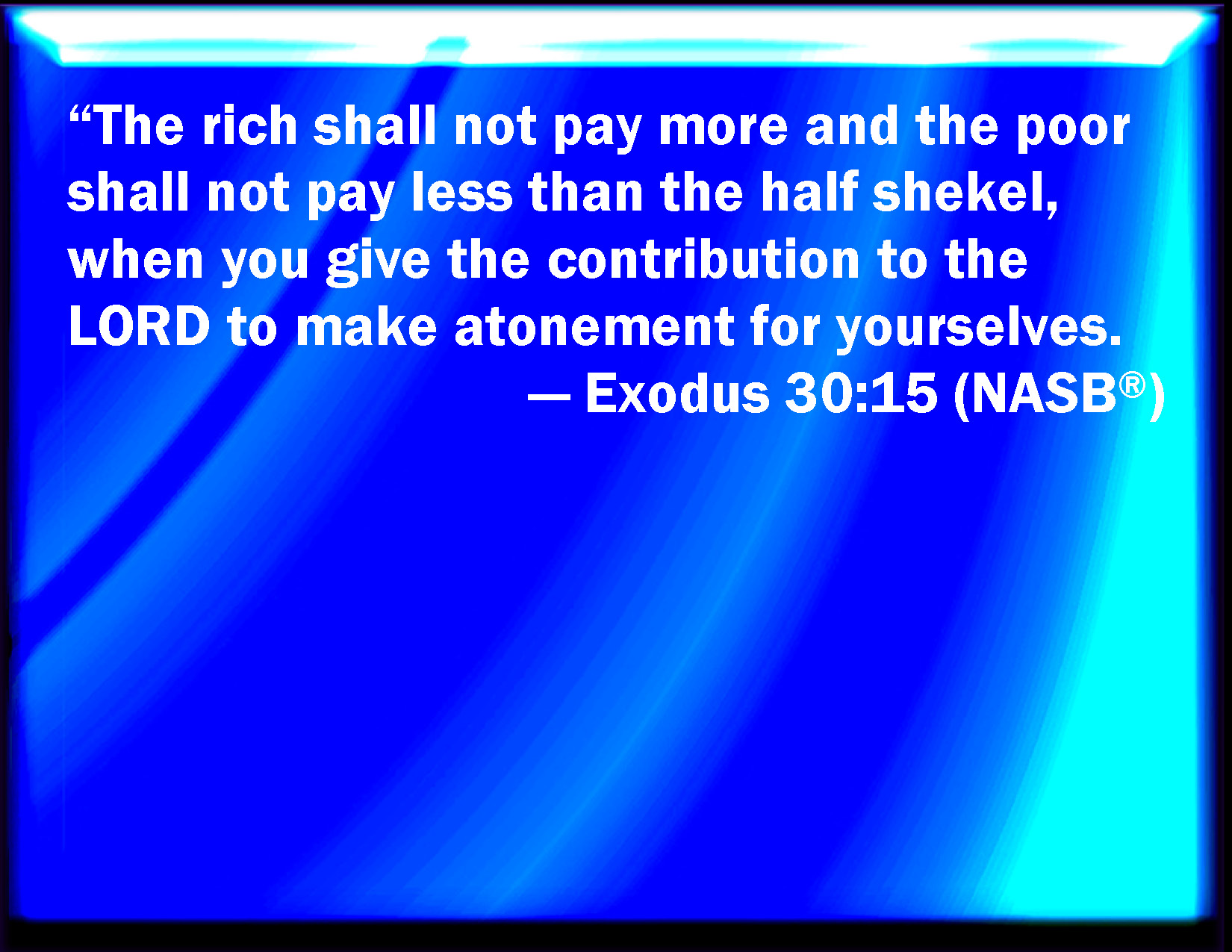 Bible Verse Slide Exodus 30:15 The rich shall not give more, and the poor shall not give less than half a shekel, when they give an offering to the LORD, to make an atonement for your souls. KJV: The rich shall not give more, and the poor shall not give less than half a shekel, when they give an offering unto the LORD, to make an atonement for your souls. DRB: The rich man shall not add to half a sicle, and the poor man shall diminish nothing. DBT: The rich shall not give more, and the poor shall not give less than half a shekel, when ye give the heave-offering of Jehovah, to make atonement for your souls. ERV: The rich shall not give more, and the poor shall not give less, than the half shekel, when they give the offering of the LORD, to make atonement for your souls. WBT: The rich shall not give more, and the poor shall not give less than half a shekel, when they give an offering to the LORD to make an atonement for your souls. WEB: The rich shall not give more, and the poor shall not give less, than the half shekel, when they give the offering of Yahweh, to make atonement for your souls. YLT: the rich doth not multiply, and the poor doth not diminish from the half-shekel, to give the heave-offering of Jehovah, to make atonement for your souls.Links Exodus 30:15 NIV • Exodus 30:15 NLT • Exodus 30:15 ESV • Exodus 30:15 NASB • Exodus 30:15 KJV • Exodus 30:15 Interlinear • Exodus 30:15 Commentaries • Exodus 30:15 Parallel Texts • Exodus 30:15 Bible Apps • Exodus 30:15 Parallel • Bible Hub |