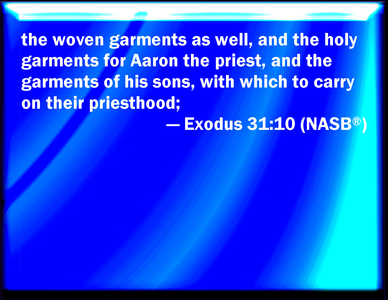 Bible Verse Slide Exodus 31:10 And the cloths of service, and the holy garments for Aaron the priest, and the garments of his sons, to minister in the priest's office, KJV: And the cloths of service, and the holy garments for Aaron the priest, and the garments of his sons, to minister in the priest's office, DRB: The holy vestments in the ministry for Aaron the priest, and for his sons, that they may execute their office about the sacred things: DBT: and the garments of service, both the holy garments of Aaron the priest, and the garments of his sons, to serve as priests; ERV: and the finely wrought garments, and the holy garments for Aaron the priest, and the garments of his sons, to minister in the priest's office; WBT: And the clothes of service, and the holy garments for Aaron the priest, and the garments of his sons, to minister in the priest's office, WEB: the finely worked garments—the holy garments for Aaron the priest—the garments of his sons to minister in the priest's office, YLT: and the coloured garments, and the holy garments for Aaron the priest, and the garments of his sons, for acting as priests in;Links Exodus 31:10 NIV • Exodus 31:10 NLT • Exodus 31:10 ESV • Exodus 31:10 NASB • Exodus 31:10 KJV • Exodus 31:10 Interlinear • Exodus 31:10 Commentaries • Exodus 31:10 Parallel Texts • Exodus 31:10 Bible Apps • Exodus 31:10 Parallel • Bible Hub |