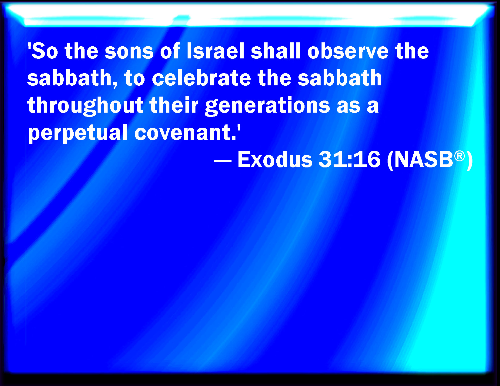 Bible Verse Slide Exodus 31:16 Why the children of Israel shall keep the sabbath, to observe the sabbath throughout their generations, for a perpetual covenant. KJV: Wherefore the children of Israel shall keep the sabbath, to observe the sabbath throughout their generations, for a perpetual covenant. DRB: Let the children of Israel keep the sabbath, and celebrate it in their generations. It is an everlasting covenant DBT: And the children of Israel shall keep the sabbath, to observe the sabbath throughout their generations it is an everlasting covenant. ERV: Wherefore the children of Israel shall keep the sabbath, to observe the sabbath throughout their generations, for a perpetual covenant. WBT: Wherefore the children of Israel shall keep the sabbath, to observe the sabbath throughout their generations, for a perpetual covenant. WEB: Therefore the children of Israel shall keep the Sabbath, to observe the Sabbath throughout their generations, for a perpetual covenant. YLT: and the sons of Israel have observed the sabbath; to keep the sabbath to their generations is a covenant age-during,Links Exodus 31:16 NIV • Exodus 31:16 NLT • Exodus 31:16 ESV • Exodus 31:16 NASB • Exodus 31:16 KJV • Exodus 31:16 Interlinear • Exodus 31:16 Commentaries • Exodus 31:16 Parallel Texts • Exodus 31:16 Bible Apps • Exodus 31:16 Parallel • Bible Hub |