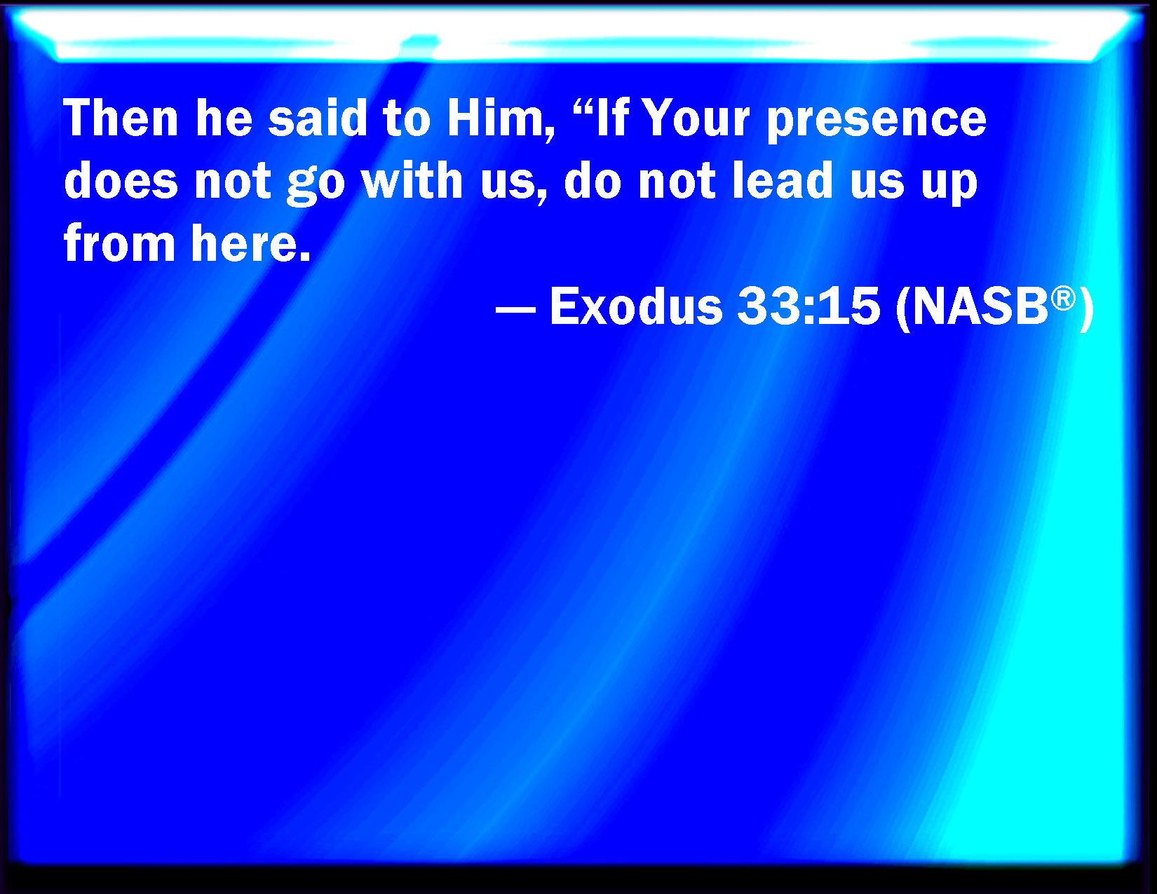 Bible Verse Slide Exodus 33:15 And he said to him, If your presence go not with me, carry us not up hence. KJV: And he said unto him, If thy presence go not with me, carry us not up hence. DRB: And Moses said: If thou thyself dost not go before, bring us not out of this place. DBT: And he said to him, If thy presence do not go, bring us not up hence. ERV: And he said unto him, If thy presence go not with me, carry us not up hence. WBT: And he said to him, If thy presence shall not attend me, conduct us not hence. WEB: He said to him, "If your presence doesn't go with me, don't carry us up from here. YLT: And he saith unto Him, 'If Thy presence is not going — take us not up from this place;Links Exodus 33:15 NIV • Exodus 33:15 NLT • Exodus 33:15 ESV • Exodus 33:15 NASB • Exodus 33:15 KJV • Exodus 33:15 Interlinear • Exodus 33:15 Commentaries • Exodus 33:15 Parallel Texts • Exodus 33:15 Bible Apps • Exodus 33:15 Parallel • Bible Hub |