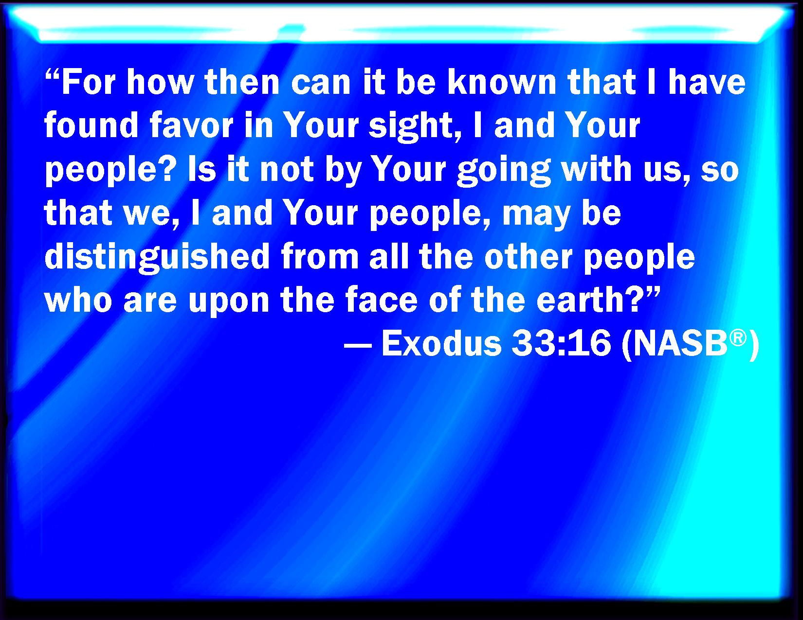Bible Verse Slide Exodus 33:16 For wherein shall it be known here that I and your people have found grace in your sight? is it not in that you go with us? so shall we be separated, I and your people, from all the people that are on the face of the earth. KJV: For wherein shall it be known here that I and thy people have found grace in thy sight? is it not in that thou goest with us? so shall we be separated, I and thy people, from all the people that are upon the face of the earth. DRB: For how shall we be able to know, I and thy people, that we have found grace in thy sight, unless thou walk with us, that we may be glorified by all people that dwell upon the earth? DBT: And how shall it be known then that I have found grace in thine eyes I and thy people? Is it not by thy going with us? so shall we be distinguished, I and thy people, from every people that is on the face of the earth. ERV: For wherein now shall it be known that I have found grace in thy sight, I and thy people? is it not in that thou goest with us, so that we be separated, I and thy people, from all the people that are upon the face of the earth? WBT: For wherein shall it be known here that I and thy people have found grace in thy sight? Is it not in that thou goest with us? So shall we be separated, I and thy people, from all the people that are upon the face of the earth. WEB: For how would people know that I have found favor in your sight, I and your people? Isn't it in that you go with us, so that we are separated, I and your people, from all the people who are on the surface of the earth?" YLT: and in what is it known now, that I have found grace in Thine eyes — I and Thy people — is it not in Thy going with us? and we have been distinguished — I and Thy people — from all the people who are on the face of the ground.'Links Exodus 33:16 NIV • Exodus 33:16 NLT • Exodus 33:16 ESV • Exodus 33:16 NASB • Exodus 33:16 KJV • Exodus 33:16 Interlinear • Exodus 33:16 Commentaries • Exodus 33:16 Parallel Texts • Exodus 33:16 Bible Apps • Exodus 33:16 Parallel • Bible Hub |