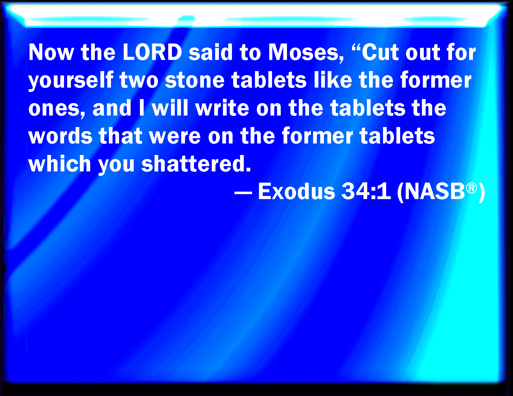 Bible Verse Slide Exodus 34:1 And the LORD said to Moses, Hew you two tables of stone like to the first: and I will write on these tables the words that were in the first tables, which you brake. KJV: And the LORD said unto Moses, Hew thee two tables of stone like unto the first: and I will write upon these tables the words that were in the first tables, which thou brakest. DRB: And after this he said: Hew thee two tables of stone like unto the former, and I will write upon them the words which were in the tables, which thou brokest. DBT: And Jehovah said to Moses, Hew for thyself two tables of stone like the first; and I will write upon the tables the words that were upon the first tables, which thou hast broken. ERV: And the LORD said unto Moses, Hew thee two tables of stone like unto the first: and I will write upon the tables the words that were on the first tables, which thou brakest. WBT: And the LORD said to Moses, Hew thee two tables of stone like the first; and I will write upon these tables the words that were in the first tables which thou didst break. WEB: Yahweh said to Moses, "Chisel two stone tablets like the first: and I will write on the tablets the words that were on the first tablets, which you broke. YLT: And Jehovah saith unto Moses, 'Hew for thyself two tables of stone like the first, and I have written on the tables the words which were on the first tables which thou hast broken;Links Exodus 34:1 NIV • Exodus 34:1 NLT • Exodus 34:1 ESV • Exodus 34:1 NASB • Exodus 34:1 KJV • Exodus 34:1 Interlinear • Exodus 34:1 Commentaries • Exodus 34:1 Parallel Texts • Exodus 34:1 Bible Apps • Exodus 34:1 Parallel • Bible Hub |