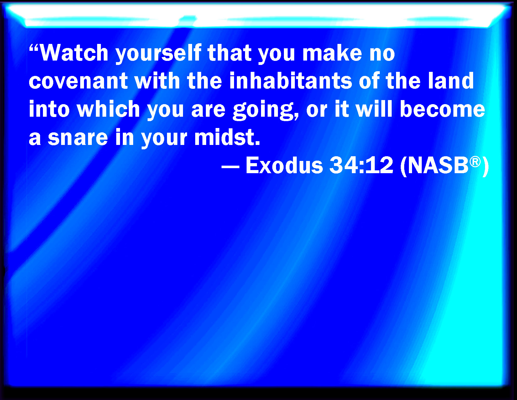 Bible Verse Slide Exodus 34:12 Take heed to yourself, lest you make a covenant with the inhabitants of the land where you go, lest it be for a snare in the middle of you: KJV: Take heed to thyself, lest thou make a covenant with the inhabitants of the land whither thou goest, lest it be for a snare in the midst of thee: DRB: Beware thou never join in friendship with the inhabitants of that land, which may be thy ruin: DBT: Take heed to thyself, that thou make no covenant with the inhabitants of the land to which thou shalt come, lest it be a snare in the midst of thee; ERV: Take heed to thyself, lest thou make a covenant with the inhabitants of the land whither thou goest, lest it be for a snare in the midst of thee: WBT: Take heed to thyself, lest thou make a covenant with the inhabitants of the land whither thou goest, lest it be for a snare in the midst of thee: WEB: Be careful, lest you make a covenant with the inhabitants of the land where you are going, lest it be for a snare in the midst of you: YLT: take heed to thyself, lest thou make a covenant with the inhabitant of the land into which thou art going, lest it become a snare in thy midst;Links Exodus 34:12 NIV • Exodus 34:12 NLT • Exodus 34:12 ESV • Exodus 34:12 NASB • Exodus 34:12 KJV • Exodus 34:12 Interlinear • Exodus 34:12 Commentaries • Exodus 34:12 Parallel Texts • Exodus 34:12 Bible Apps • Exodus 34:12 Parallel • Bible Hub |
