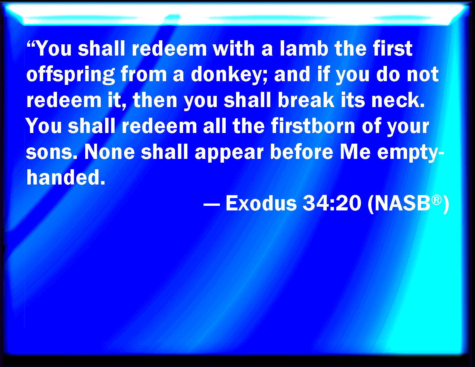 Exodus 34:20 But the firstling of an ass you shall redeem with a lamb: and if you redeem him not, then shall you break his neck. All the firstborn of your sons you shall redeem. And none shall appear before me empty.