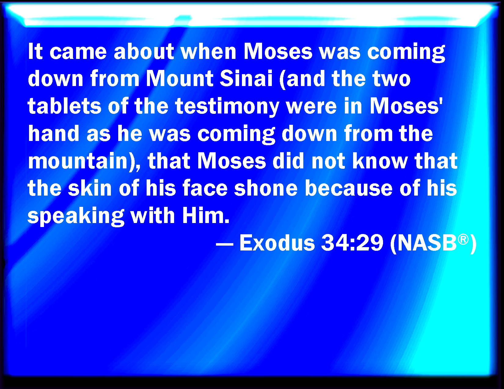 Bible Verse Slide Exodus 34:29 And it came to pass, when Moses came down from mount Sinai with the two tables of testimony in Moses' hand, when he came down from the mount, that Moses knew not that the skin of his face shone while he talked with him. KJV: And it came to pass, when Moses came down from mount Sinai with the two tables of testimony in Moses' hand, when he came down from the mount, that Moses wist not that the skin of his face shone while he talked with him. DRB: And when Moses came down from the mount Sinai, he held the two tables of the testimony, and he knew not that his face was horned from the conversation of the Lord. DBT: And it came to pass, when Moses came down from mount Sinai and the two tables of testimony were in Moses' hand, when he came down from the mountain that Moses knew not that the skin of his face shone through his talking with him. ERV: And it came to pass, when Moses came down from mount Sinai with the two tables of the testimony in Moses' hand, when he came down from the mount, that Moses wist not that the skin of his face shone by reason of his speaking with him. WBT: And it came to pass when Moses came down from mount Sinai (with the two tables of testimony in Moses's hand, when he came down from the mount) that Moses knew not that the skin of his face shone, while he talked with him. WEB: It happened, when Moses came down from Mount Sinai with the two tablets of the testimony in Moses' hand, when he came down from the mountain, that Moses didn't know that the skin of his face shone by reason of his speaking with him. YLT: And it cometh to pass, when Moses is coming down from mount Sinai (and the two tables of the testimony are in the hand of Moses in his coming down from the mount), that Moses hath not known that the skin of his face hath shone in His speaking with him,Links Exodus 34:29 NIV • Exodus 34:29 NLT • Exodus 34:29 ESV • Exodus 34:29 NASB • Exodus 34:29 KJV • Exodus 34:29 Interlinear • Exodus 34:29 Commentaries • Exodus 34:29 Parallel Texts • Exodus 34:29 Bible Apps • Exodus 34:29 Parallel • Bible Hub |