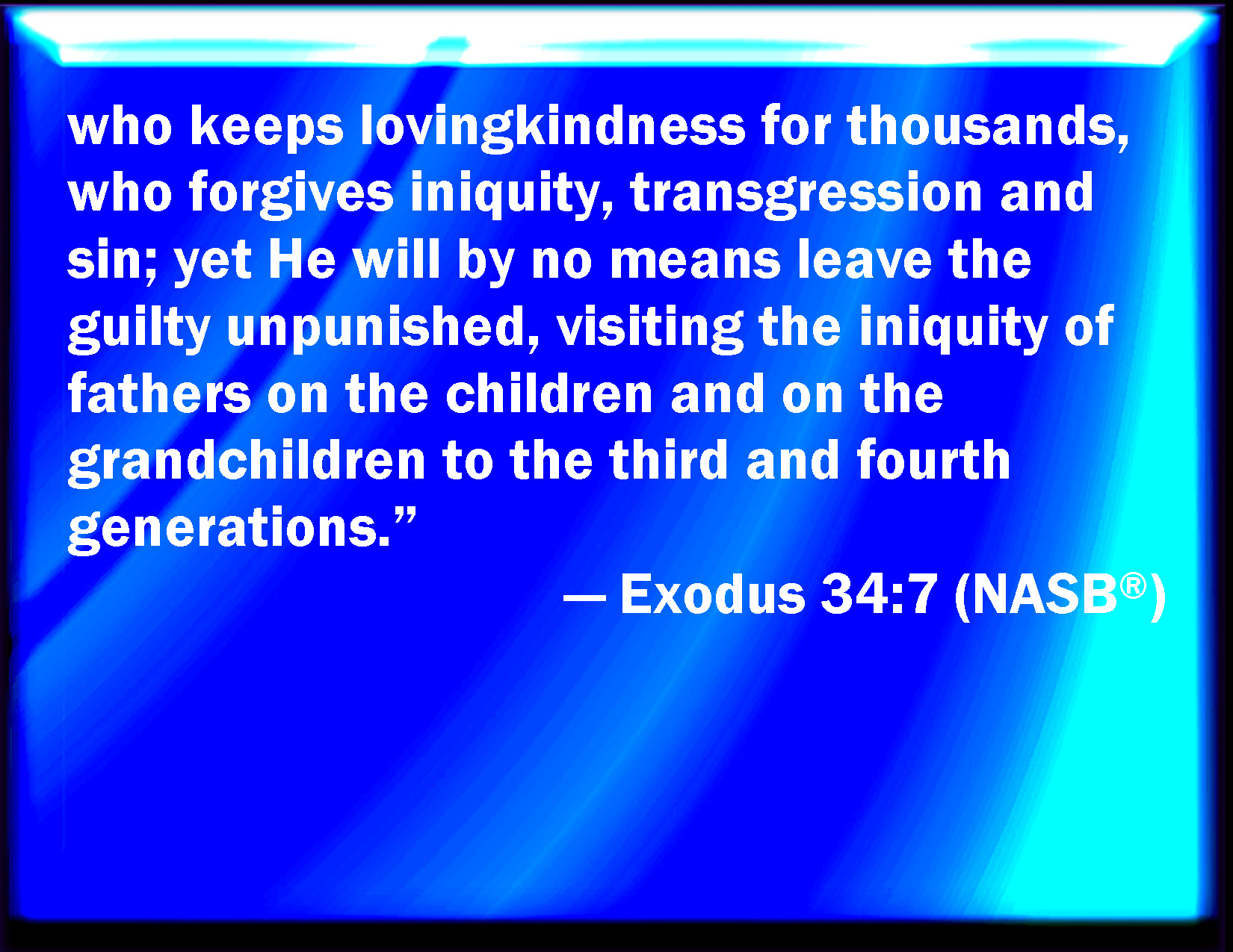 Bible Verse Slide Exodus 34:7 Keeping mercy for thousands, forgiving iniquity and transgression and sin, and that will by no means clear the guilty; visiting the iniquity of the fathers on the children, and on the children's children, to the third and to the fourth generation. KJV: Keeping mercy for thousands, forgiving iniquity and transgression and sin, and that will by no means clear the guilty; visiting the iniquity of the fathers upon the children, and upon the children's children, unto the third and to the fourth generation. DRB: Who keepest mercy unto thousands: who takest away iniquity, and wickedness, and sin, and no man of himself is innocent before thee. Who renderest the iniquity of the fathers to the children, and to the grandchildren, unto the third and fourth generation. DBT: keeping mercy unto thousands, forgiving iniquity and transgression and sin, but by no means clearing the guilty; visiting the iniquity of the fathers upon the children, and upon the children's children, upon the third and upon the fourth generation. ERV: keeping mercy for thousands, forgiving iniquity and transgression and sin: and that will by no means clear the guilty; visiting the iniquity of the fathers upon the children, and upon the children's children, upon the third and upon the fourth generation. WBT: Keeping mercy for thousands, forgiving iniquity and transgression and sin, and that will by no means clear the guilty; visiting the iniquity of the fathers upon the children, and upon the children's children, to the third and to the fourth generation. WEB: keeping loving kindness for thousands, forgiving iniquity and disobedience and sin; and that will by no means clear the guilty, visiting the iniquity of the fathers on the children, and on the children's children, on the third and on the fourth generation." YLT: keeping kindness for thousands, taking away iniquity, and transgression, and sin, and not entirely acquitting, charging iniquity of fathers on children, and on children's children, on a third generation, and on a fourth.'Links Exodus 34:7 NIV • Exodus 34:7 NLT • Exodus 34:7 ESV • Exodus 34:7 NASB • Exodus 34:7 KJV • Exodus 34:7 Interlinear • Exodus 34:7 Commentaries • Exodus 34:7 Parallel Texts • Exodus 34:7 Bible Apps • Exodus 34:7 Parallel • Bible Hub |