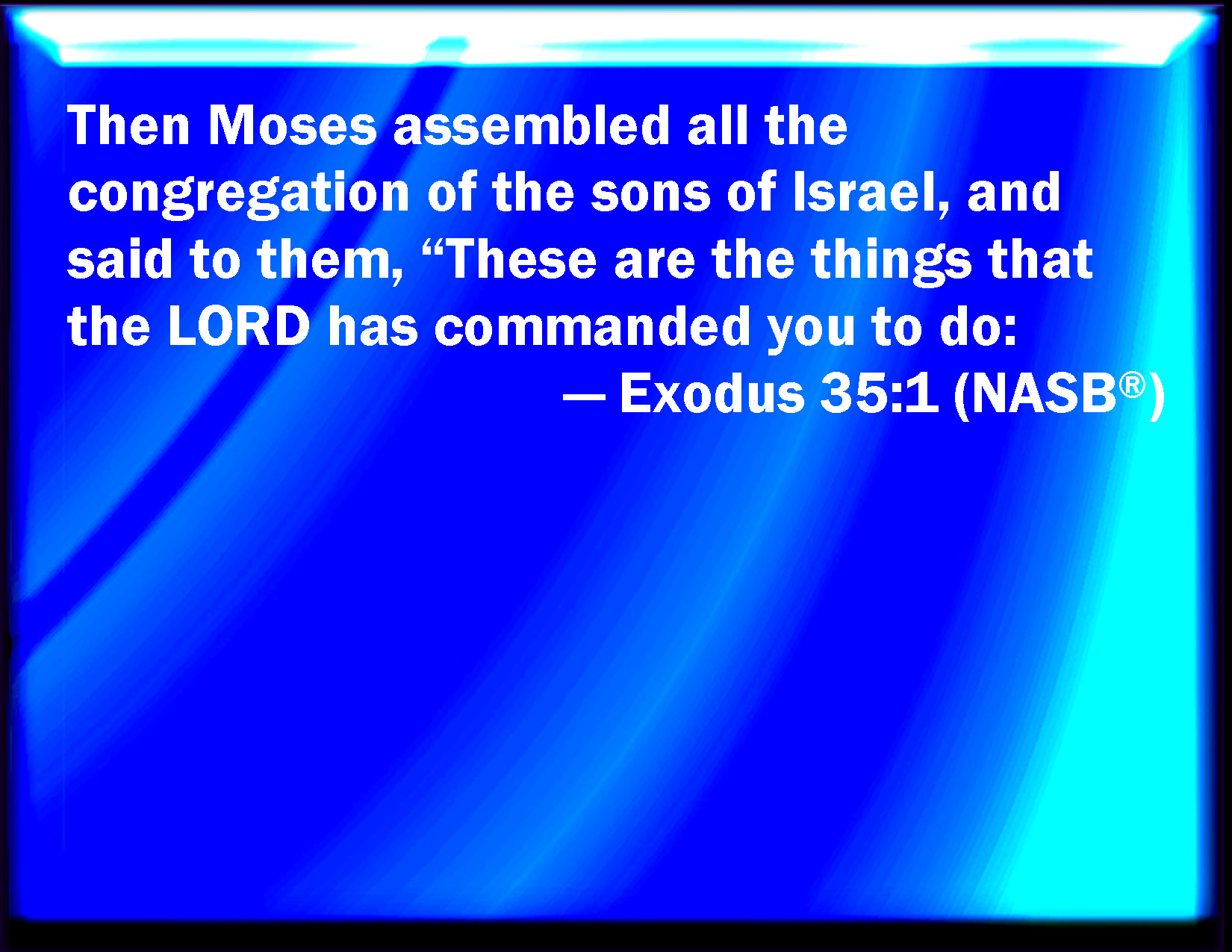 Bible Verse Slide Exodus 35:1 And Moses gathered all the congregation of the children of Israel together, and said to them, These are the words which the LORD has commanded, that you should do them. KJV: And Moses gathered all the congregation of the children of Israel together, and said unto them, These are the words which the LORD hath commanded, that ye should do them. DRB: And all the multitude of the children of Israel being gathered together, he said to them: These are the things which the Lord hath commanded to be done. DBT: And Moses collected all the assembly of the children of Israel, and said to them, These are the things which Jehovah has commanded, to do them. ERV: And Moses assembled all the congregation of the children of Israel, and said unto them, These are the words which the LORD hath commanded, that ye should do them. WBT: And Moses assembled all the congregation of the children of Israel, and said to them, These are the words which the LORD hath commanded, that ye should do them. WEB: Moses assembled all the congregation of the children of Israel, and said to them, "These are the words which Yahweh has commanded, that you should do them. YLT: And Moses assembleth all the company of the sons of Israel, and saith unto them, 'These are the things which Jehovah hath commanded — to do them:Links Exodus 35:1 NIV • Exodus 35:1 NLT • Exodus 35:1 ESV • Exodus 35:1 NASB • Exodus 35:1 KJV • Exodus 35:1 Interlinear • Exodus 35:1 Commentaries • Exodus 35:1 Parallel Texts • Exodus 35:1 Bible Apps • Exodus 35:1 Parallel • Bible Hub |
